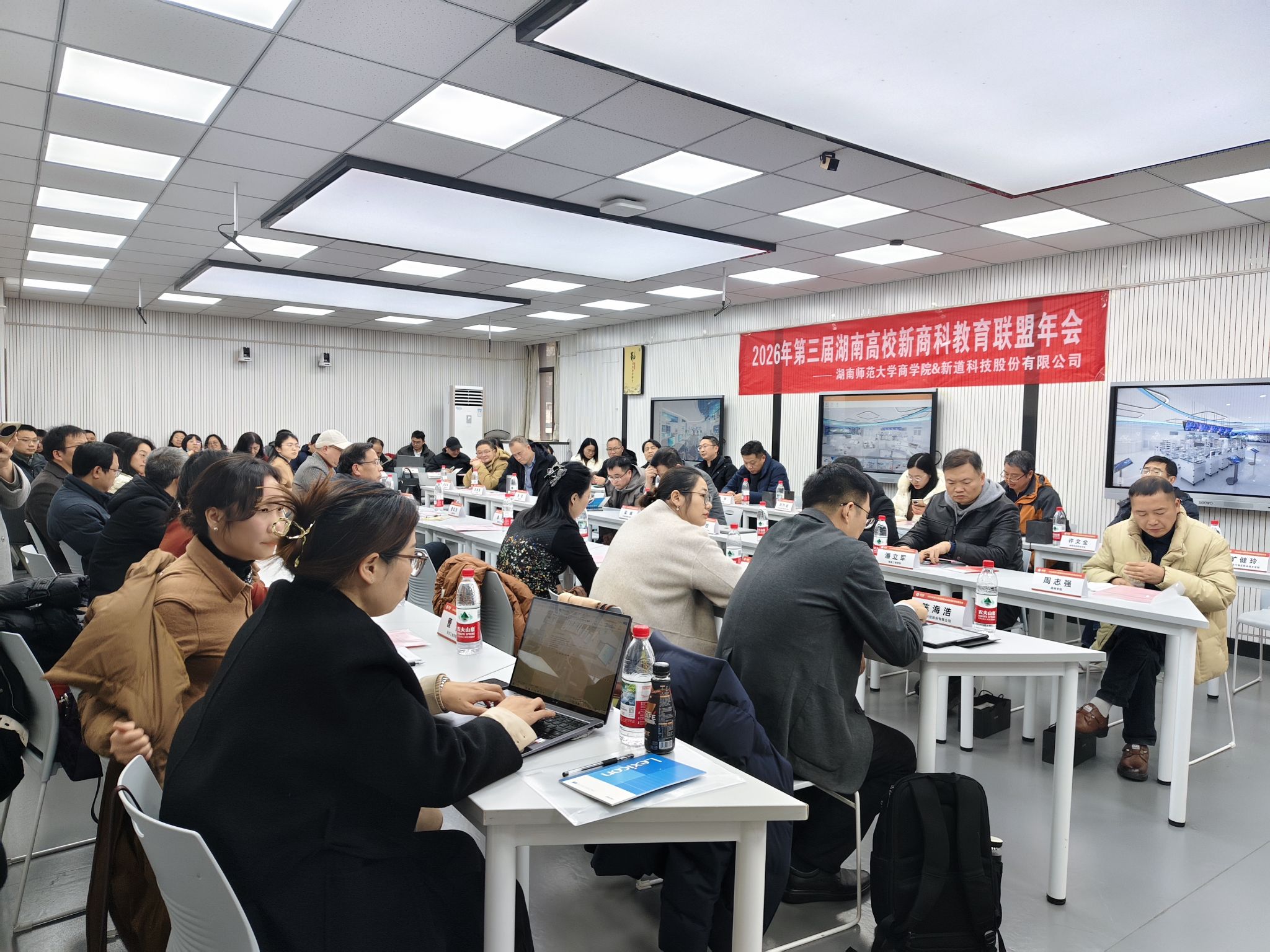 1月30日,由我院与新道科技股份有限公司联合承办的第三届湖南高校新商科教育联盟年会在我院中和楼610会议室召开。会议以“产教融合 AI赋能 智育商科新质人才”为主题,汇聚了来自省内多所高校的商科学院院长、系主任及企业专家代表近60人,共同探讨人工智能时代背景下商科教育的数智化转型与创新发展路径。会议由我院副院长(主持工作)曹虹剑教授主持。