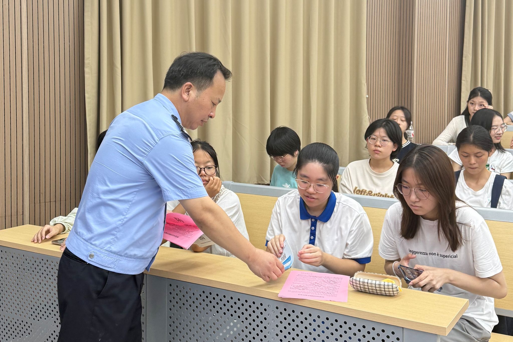 陈芳桂总结了高校电信网络诈骗案件发案特点。他表示,每年高校学生遭遇电信诈骗的涉案总金额不菲,防诈教育切实关系到同学们的实际利益。整场讲座通过生动形象的案例剖析,系统介绍了刷单返利、虚假购物、冒充客服等高发的电信诈骗类型,并传授了切实有效的识别方法与防范技巧。讲座过后,各班集中观看了《一堂反诈课》视频,并同步开展了宗教政策法律知识宣传,进一步筑牢了新生的安全与法治观念。
