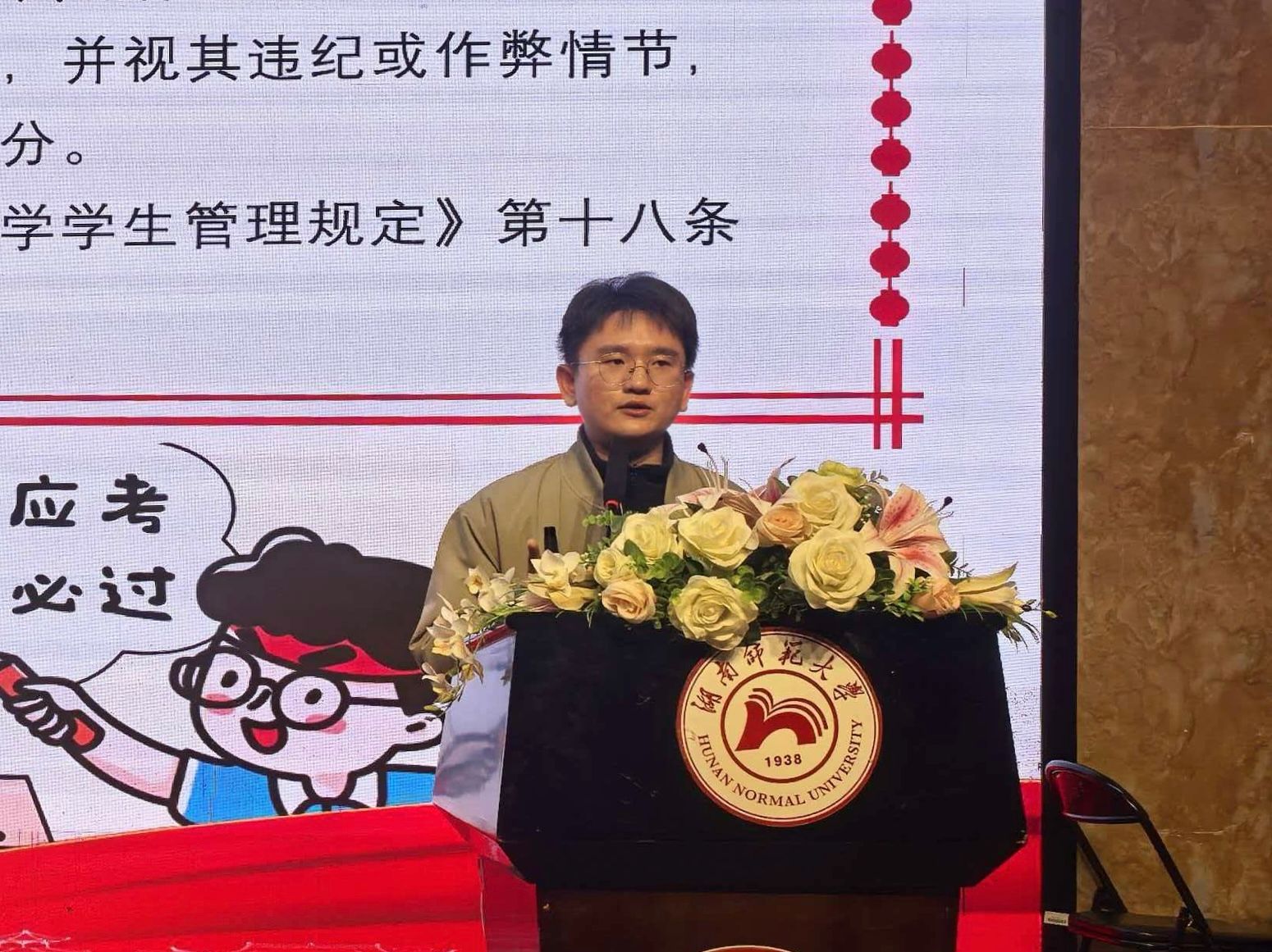 徐家松就期末备考和假期安全工作作具体安排。他叮嘱同学们科学备考、合理安排复习时间,并强调诚信应考的重要性,详细说明了考试的各项注意事项。徐家松还重点强调元旦假期及寒假期间的安全问题,特别提醒同学们防范网络诈骗,并传达相关通知。