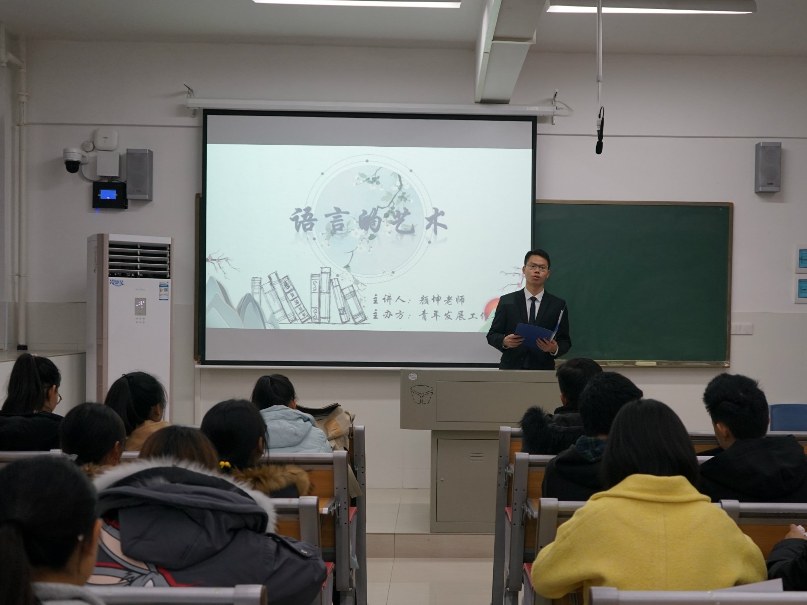 12月13日晚,商学院在中和楼220教室举办“语言的艺术”主题讲座。此次讲座由青发部干事曾豪乐主持,18级辅导员颜坤担任此次讲座的主讲人。