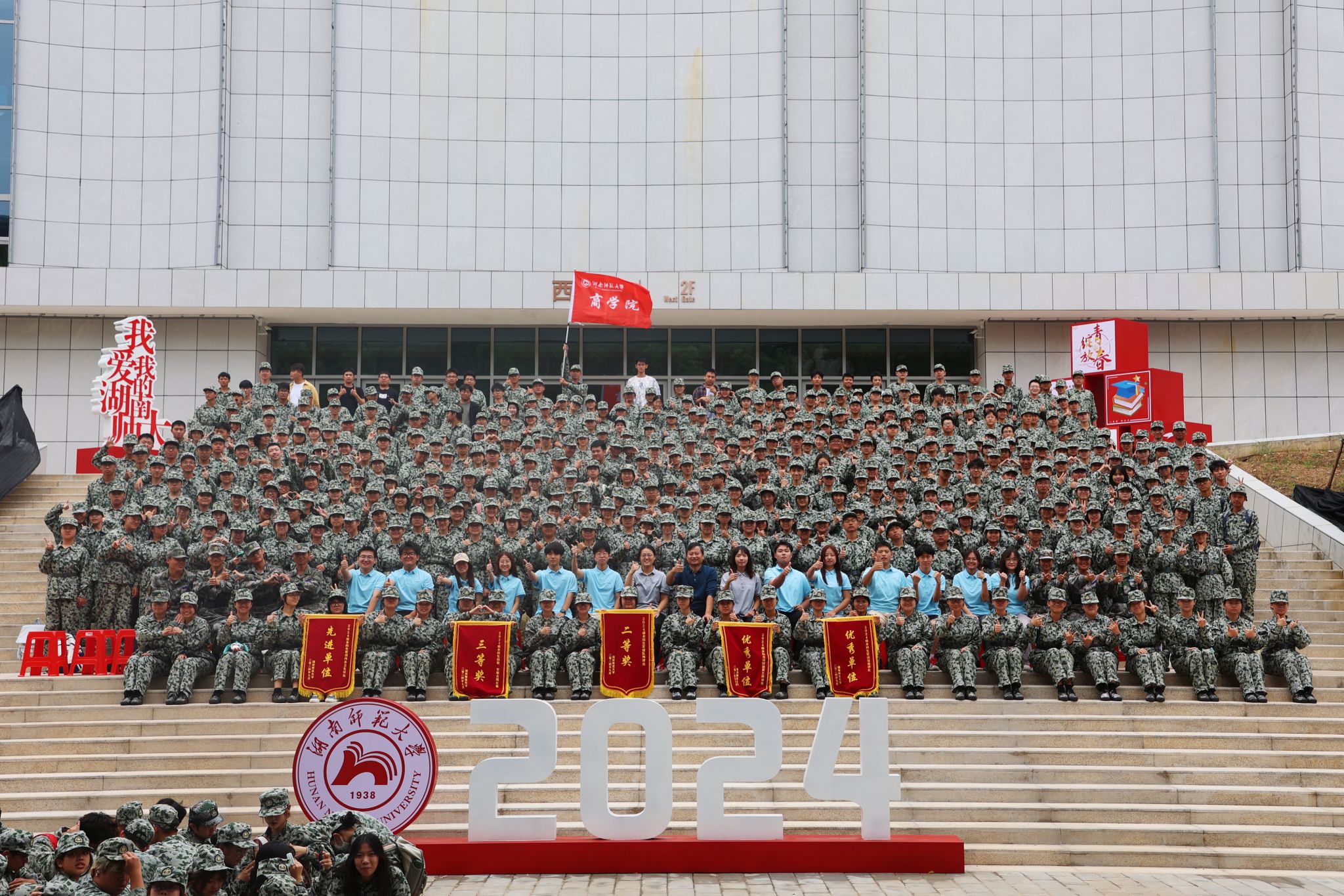 新生军训成果汇报暨总结表彰大会结束后,商学院党委副书记刘杰,2024级辅导员聂志欣、梁绮珈,全体新生助理辅导员与全体新生合影留念。