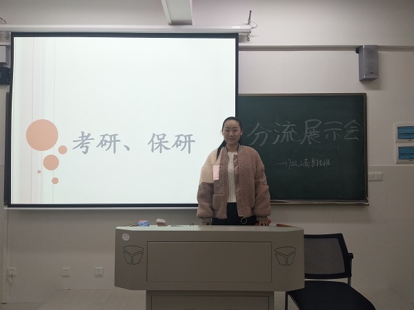 韩梦玮主要就考研、保研两个方面进行分享。她介绍了一些基本的考研常识,例如考研时间线、专业课与公共课的考试内容以及重要考研资讯的公布时间等。随后,韩梦玮重点介绍了保研的相关知识,她列出了综合推免保研的几个条件,同时介绍了保研的流程与时间线,希望同学们抓住机会,努力学习。陈鑫楠主要从就业方面展开交流,通过大量数据介绍毕业生的就业分布情况以及目前的就业形势,宽慰同学们乐观看待就业。在准备工作方面,她认为同学们要进行自我定位,同时多关注各网址的招聘信息,加强相关知识的储备和能力的提升。最后,刘伟杰对此次活动进行总结,再次强调考研与就业选择的重要性,表示希望同学们慎重考虑,做出正确的选择。