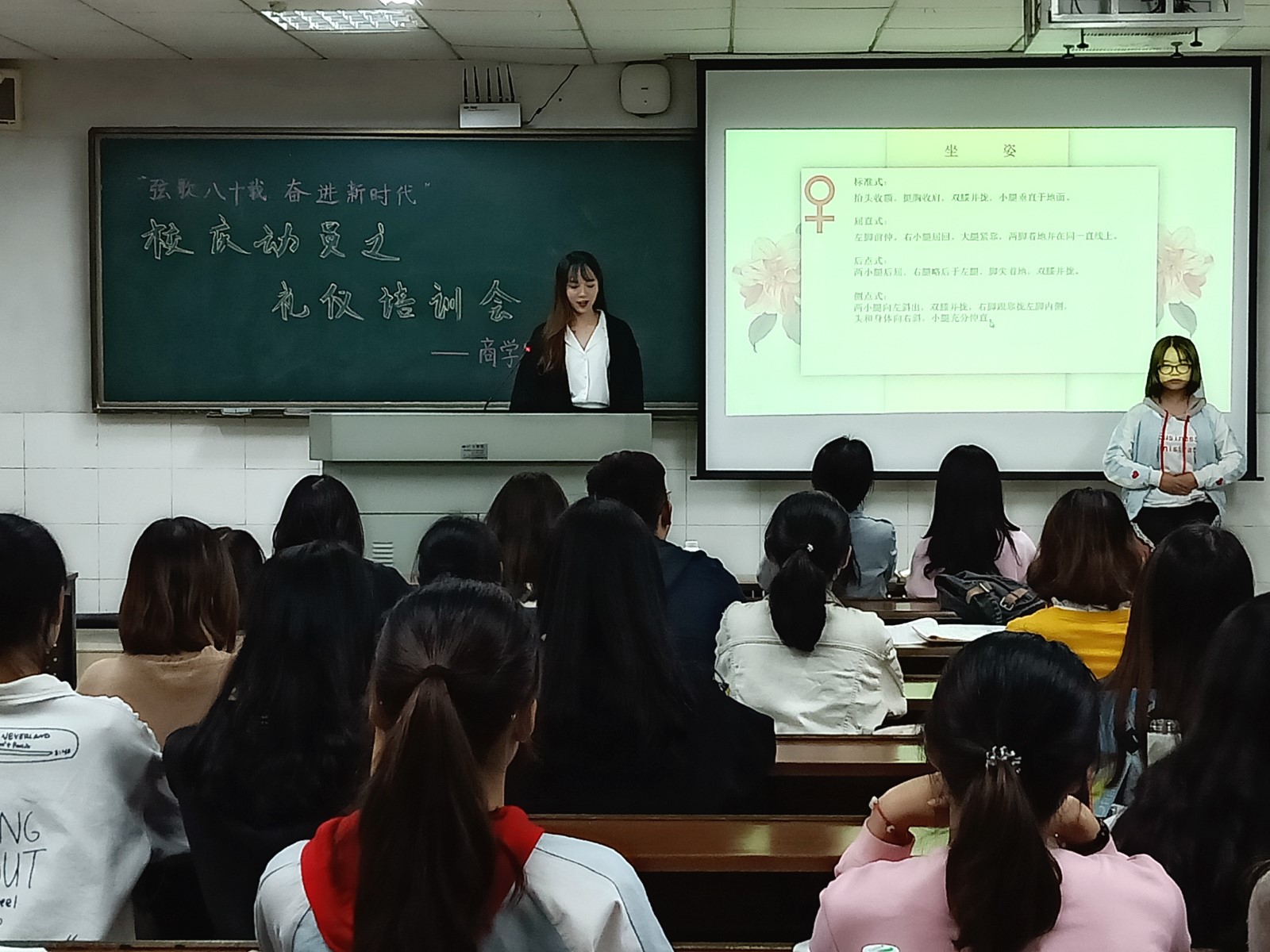 10月12日晚,商学院在至善楼107教室举办校庆志愿者礼仪培训会。礼仪总负责人高义与礼仪队长刘寒雪为主讲人,青工部部长李春桃主持此次活动。
