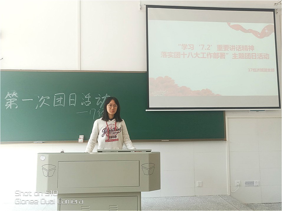 10月11日下午,商学院17级经济班在新理化楼114教室举办以“学习‘7.2’重要讲话精神,落实团十八大工作部署”为主题的团日活动。此次活动由团支书李诗婷主持。