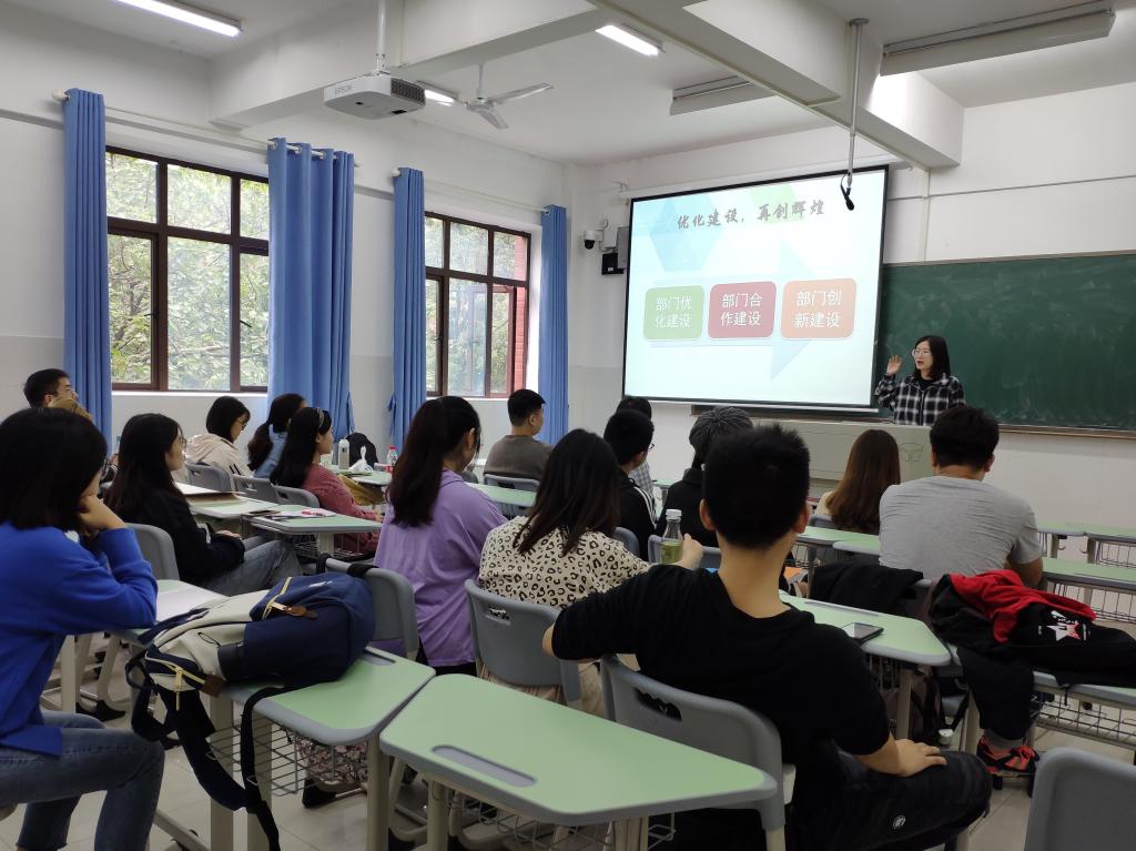 会议初始,王一帆介绍了会议流程并对新一届研学会提出进行部门优化建设、部门合作建设、部门创新建设和八个部门八位一体的工作设想。随后,主席团、学术部、生活部等八个部门成员依次上台自我介绍并做工作任务汇报。