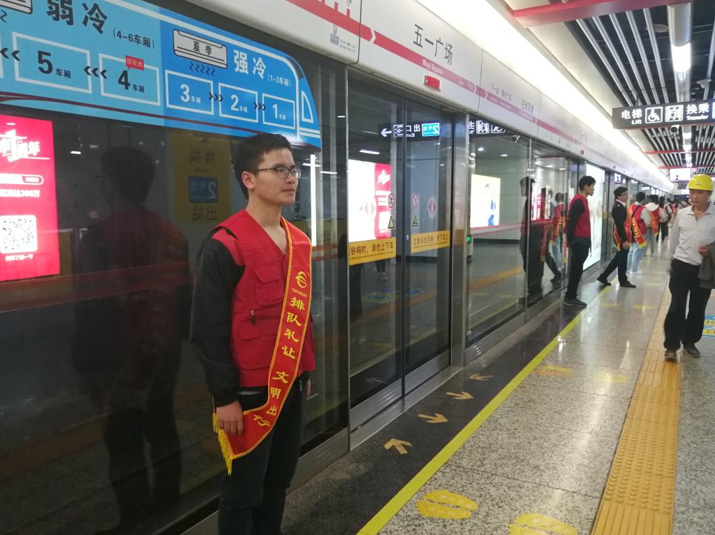 20名志愿者提前到达五一广场地铁站集合,在地铁站负责人蒋珮的任务安排后,开始志愿活动。首先,志愿者们参与“文明乘车,快乐随行”排队日活动彩排,随后作为学生代表观看表演并进行文明乘车宣誓。接着,志愿者们穿上红马甲戴上绶带,在工作人员的带领下分组前往各个地铁线路指引乘客文明排队、先下后上。志愿者的宣传让更多人知道了排队日的概念,也在乘客心中留下了文明乘车的观念。活动结束后部分志愿者合影留念。