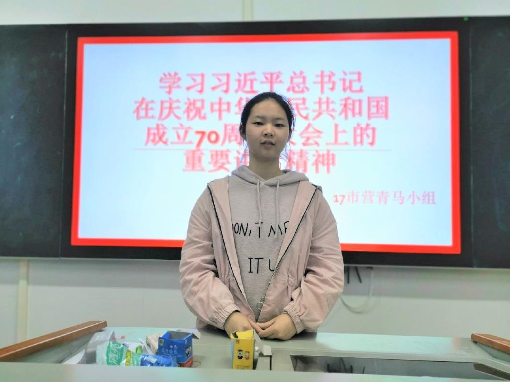 (通讯员 李焱霞 魏家欣 苏雅萱)11月12日下午,17级市营班青马一组在中和楼210教室开展了以“学习习近平总书记在庆祝中华人民共和国成立70周年大会上的重要讲话精神”为主题的青马小组理论学习活动,此次活动由青马小组组长魏家欣担任主持人。
