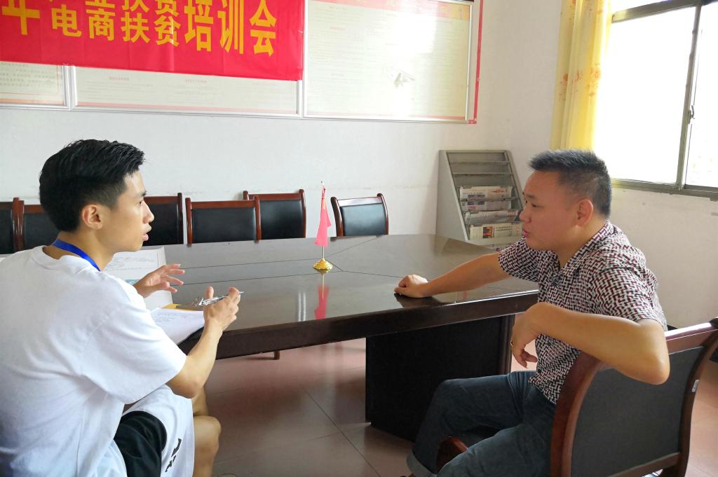 (通讯员 刘跨文 杨慧中 李永俊)8月2日,为深入了解红星村电子商务发展情况和脱贫攻坚状况,商学院红色筑梦之旅实践团调研组成员在红星村村委会办公室对村主任杨卫平进行访谈。
