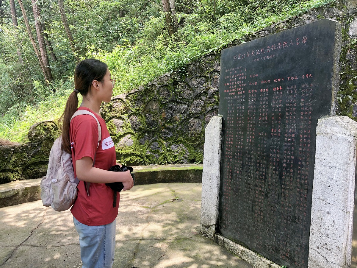 实践团瞻仰了芙蓉关红军长征纪念碑,观看烈士碑文,重温入党誓词,集体献上鲜花并在碑前为红军长征烈士默哀三分钟。随后,乡政府党建工作人员何云洁向实践团说明该地现已被列为沅陵县级爱国主义教育基地和革命老区传统教育基地,为成员们讲解芙蓉关红军长征纪念碑的来历和历史意义。陶子烨发言提出,作为新时代青年应积极主动地了解党史知识,传承红色基因,为时代的发展贡献力量。