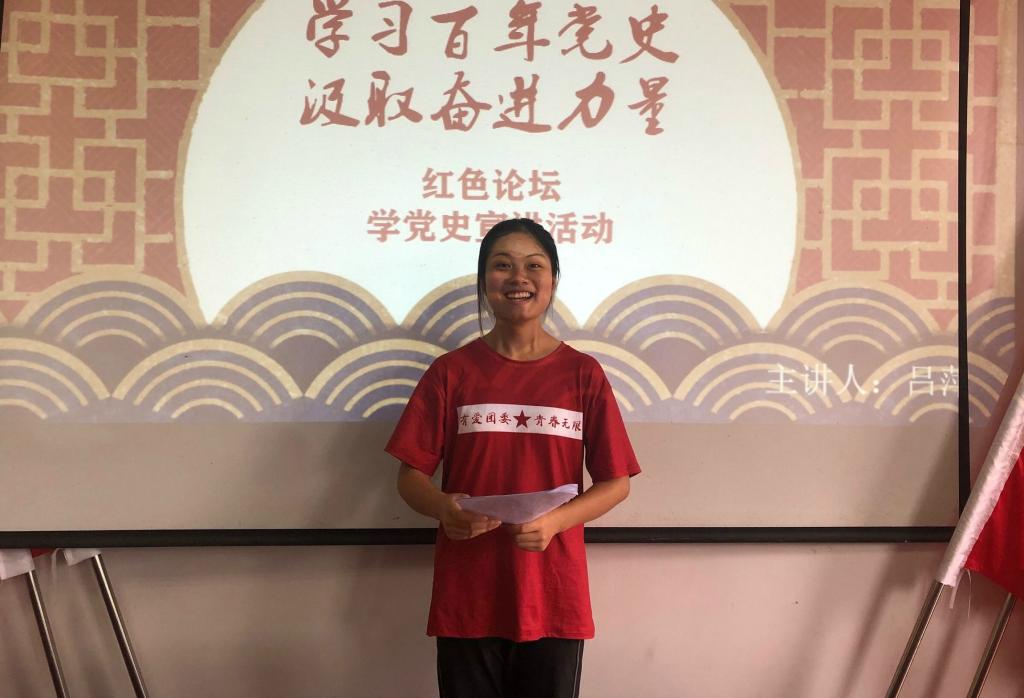 吕萍提出,开展党史学习教育,践行学史明理,学史增信,学史崇德,学史力行,从党的百年伟大奋斗历程中汲取继续前进的智慧和力量,对增强民族凝聚力有着重要作用。她详细讲解了土地革命战争时期与抗战时期中国共产党领导的重要行动以及发生的重要事件,总结党的历史经验与教训。最后她强调,作为新时代青年,应矢志拼搏奋斗,深植爱国情怀,在传承血脉中前进。
