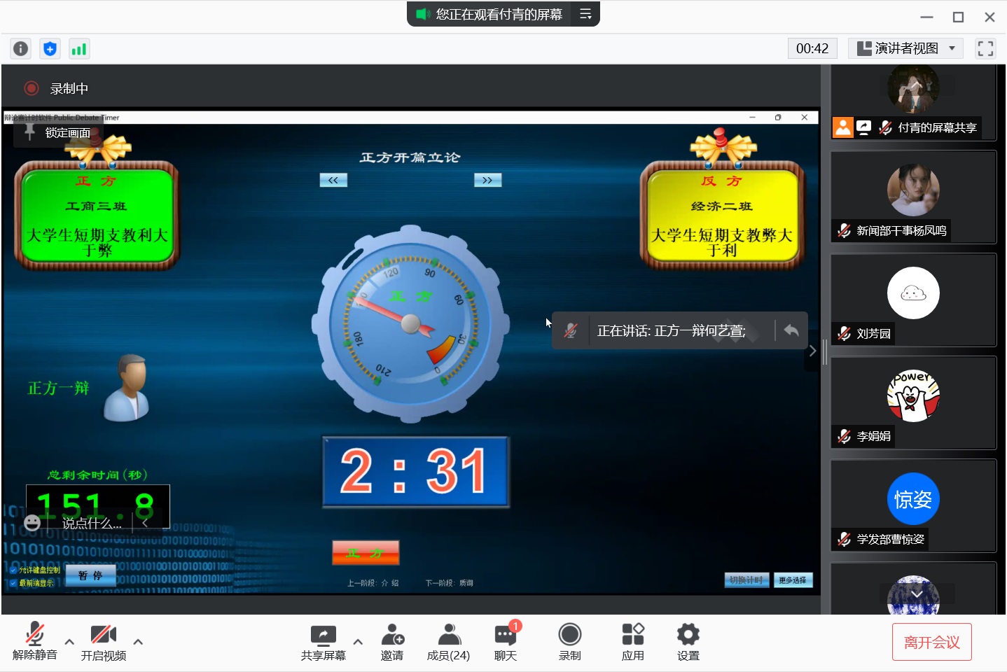 正方工商三班从短期支教能够充足师资力量和改善教育资源不平均两个方面来论述,反方经济二班用短期支教没有对主客体及乡村教育现状产生实质性效益进行反驳。正方工商一班用温饱对人类社会活动和生产力发展的重要性进行论证,反方工商二班用温饱与道德相互独立,理性才是道德的前提条件两个方面进行反驳。正方经济三班从网络匿名的平等性、安全性、积极性来进行论述,反方经济一班则从网络匿名特性影响公共讨论产出建设性成果进行反驳。