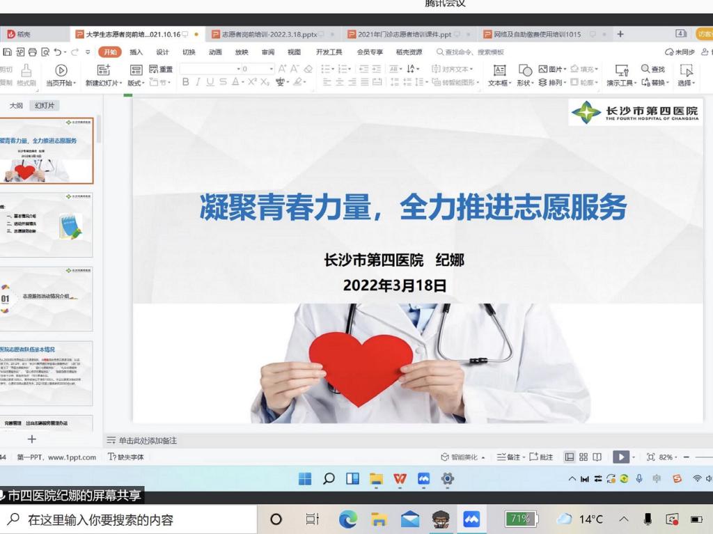 根据医院需要,此次活动一共划分11个岗位,共招募176名志愿者。为确保“医路有你”志愿者服务活动的顺利进行,且由于疫情防控需要,志愿者们在线上开展此次岗前培训活动。下午志愿者们进入腾讯会议APP开始打卡签到。活动正式开始,志愿者们根据四医院主讲师对医院和个人职责的相关介绍,明确自己的权利、义务和保障以及此次志愿活动的要求,对自己的岗位有更加充分的了解。