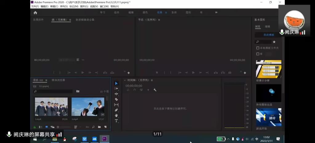 谢睿就此次会议目的和会议流程做了简单介绍,说明剪辑技能的重要性。龙晓微简单介绍了剪映APP,并对视频的剪切、配音、文本、素材使用等技能进行详细讲解。她表示,剪辑视频是一个十分消耗精力且挑战耐心的过程,需要慢慢来。阙庆琳则介绍了Pr,对Pr操作面板及较复杂的视频剪辑技能进行教学。同学们即学即用,以刚刚学到的技能为基础,进行实际操作训练。