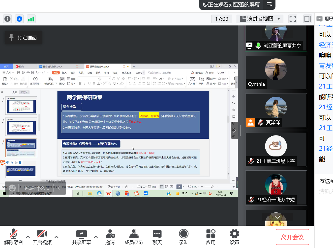 (通讯员 宋欣 谢孟洁)4月8日中午,商学院团委青年发展工作部在腾讯会议举行“考研保研tips”线上主题团课。21级青发部干事夏洋洋担任此次会议的主持人,18级市场营销班刘亚蕾和18级工商管理班洪鹏飞为主讲人。