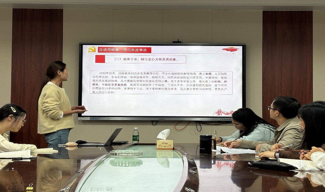 范贺贺同志介绍了2024年度“感动中国” 十大人物之一范振喜的先进事迹。她从 “走进范振喜,学习先进事迹”与“致敬范振喜,择一事终一身、不为繁华易匠心”两个方面展开。她指出,广大党员干部应学习范振喜的坚韧心劲,展现“困难面前逞英雄”的魄力和“轻伤不下火线”的意志。