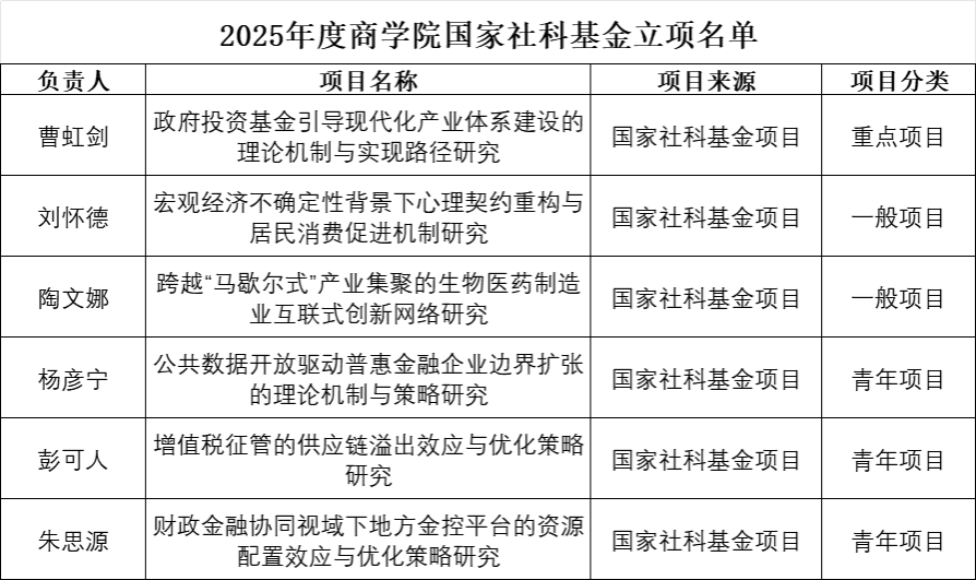 9月29日,2025年国家社科基金年度项目立项结果公布,我院获批6项,其中重点项目1项,一般项目2项,青年项目3项。立项数量与结构保持较高水平,彰显了我院在经济管理领域的学术积淀与创新活力。