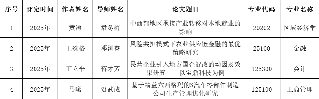 此次4篇硕士学位论文获评优秀,不仅是对我院研究生培养质量的肯定,也是对我院坚持“立德树人、科研育人”理念的生动实践。近年来,我院聚焦学科前沿与国家需求,通过强化导师负责制、搭建跨学科科研平台、推进产学研深度融合等举措,持续优化研究生培养体系,鼓励学生立足实际开展原创性研究。我院将以此为契机,充分发挥优秀学位论文的示范引领作用,着力提升学生的科研创新与社会服务能力,为服务国家和地区经济社会发展培养更多高素质人才。