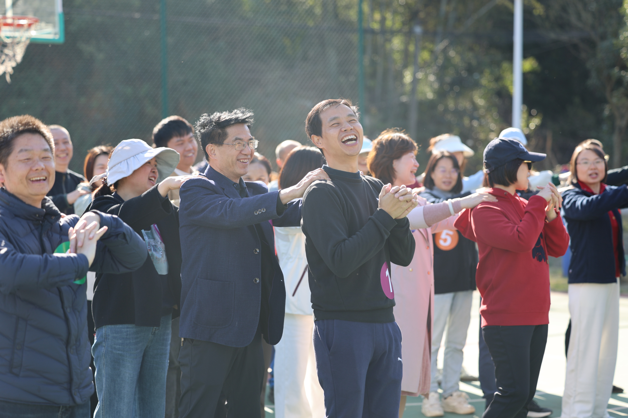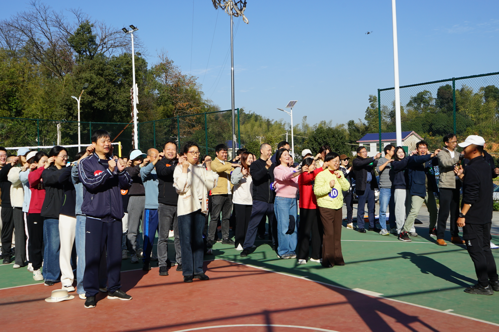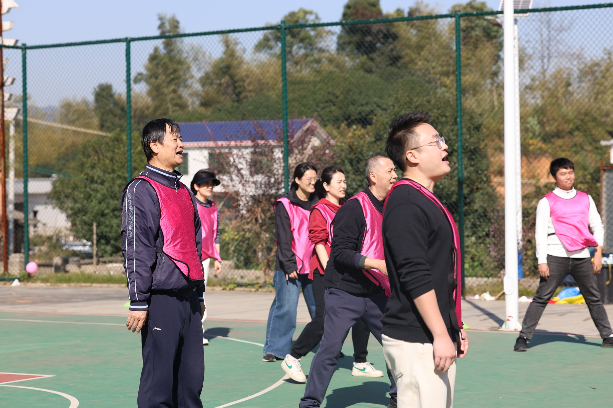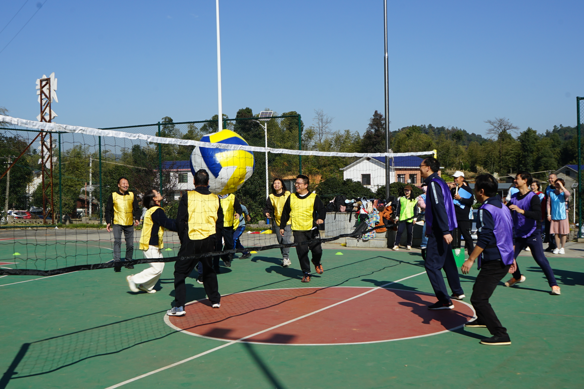 本次活动将全体教职工以抽签的方式分为 5 支队伍,在农庄专业教练的带领下,开展了各具特色、形式多样的趣味拓展项目。热身环节中,在教练引导下,老师们相互为前后同伴按摩,以轻松互动的方式活络身体、放松心情;随后进行的《桃花朵朵开》互动游戏,进一步活跃现场气氛;紧接着开展的《重走长征路》拓展游戏,过程中充满欢声笑语,队员们默契配合、互帮互助,充分展现了团队协作精神;最后各队在农庄篮球场区域展开超级气排球比赛,大家以饱满的状态投入竞技,现场氛围热烈,热情高涨。