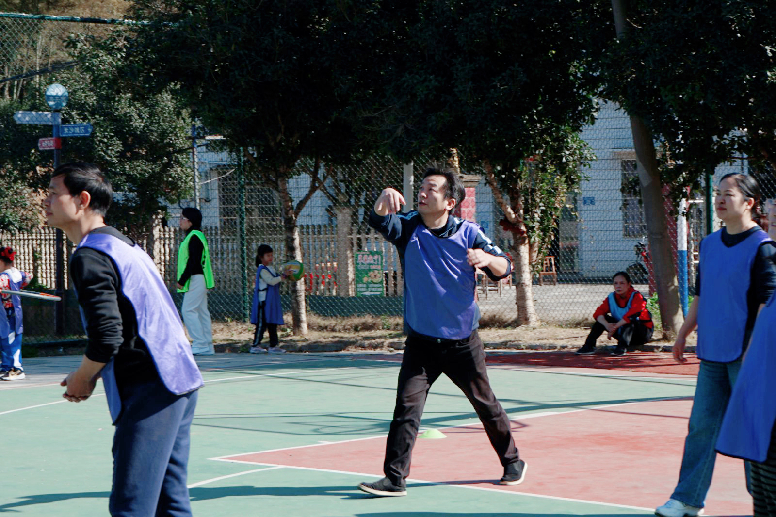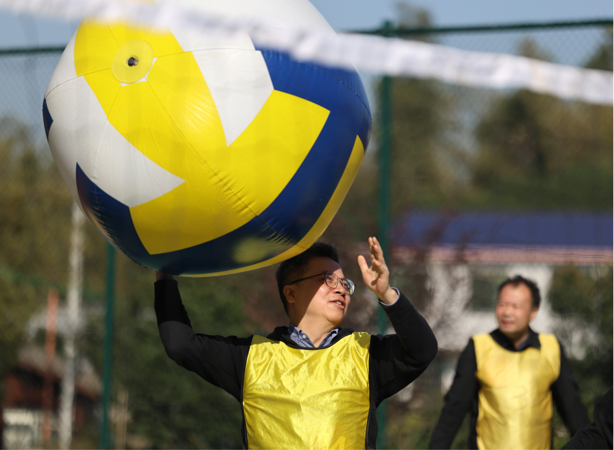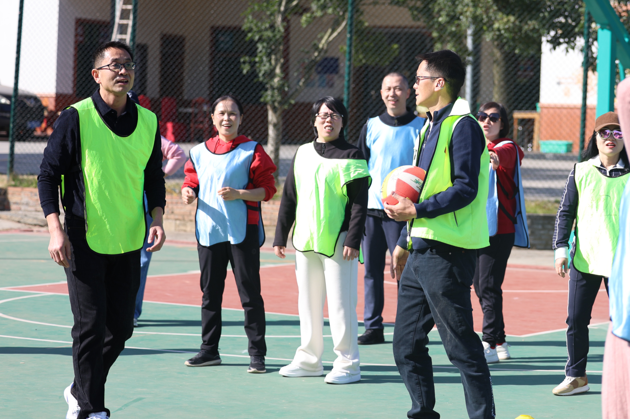 本次活动将全体教职工以抽签的方式分为 5 支队伍,在农庄专业教练的带领下,开展了各具特色、形式多样的趣味拓展项目。热身环节中,在教练引导下,老师们相互为前后同伴按摩,以轻松互动的方式活络身体、放松心情;随后进行的《桃花朵朵开》互动游戏,进一步活跃现场气氛;紧接着开展的《重走长征路》拓展游戏,过程中充满欢声笑语,队员们默契配合、互帮互助,充分展现了团队协作精神;最后各队在农庄篮球场区域展开超级气排球比赛,大家以饱满的状态投入竞技,现场氛围热烈,热情高涨。