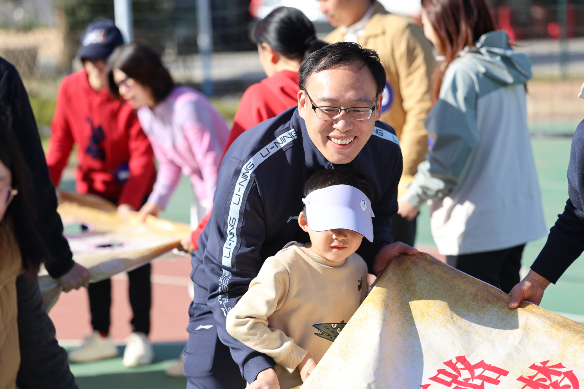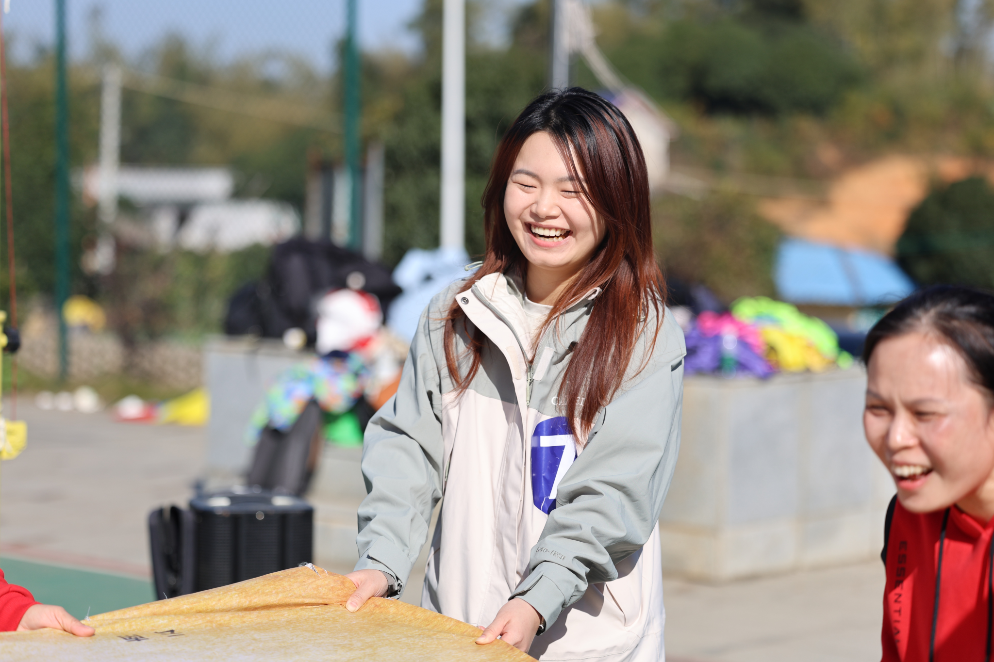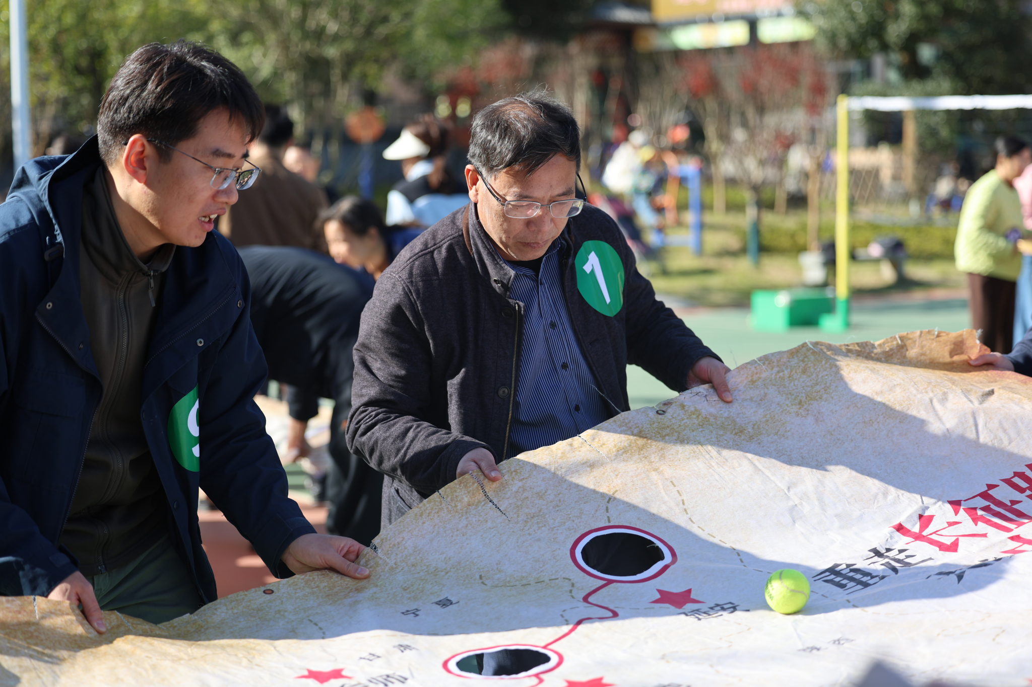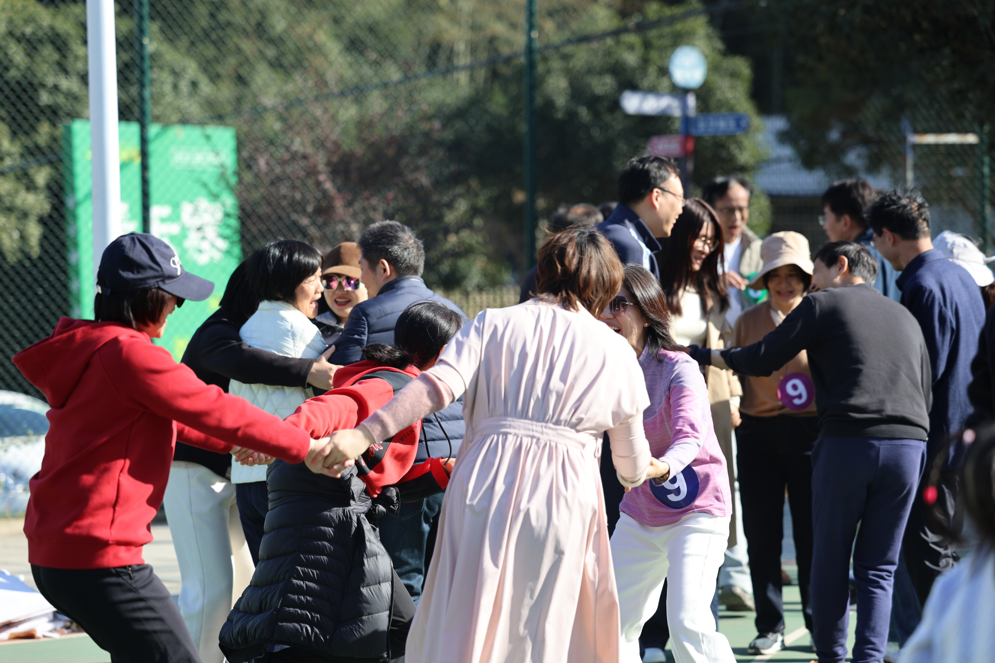 本次活动将全体教职工以抽签的方式分为 5 支队伍,在农庄专业教练的带领下,开展了各具特色、形式多样的趣味拓展项目。热身环节中,在教练引导下,老师们相互为前后同伴按摩,以轻松互动的方式活络身体、放松心情;随后进行的《桃花朵朵开》互动游戏,进一步活跃现场气氛;紧接着开展的《重走长征路》拓展游戏,过程中充满欢声笑语,队员们默契配合、互帮互助,充分展现了团队协作精神;最后各队在农庄篮球场区域展开超级气排球比赛,大家以饱满的状态投入竞技,现场氛围热烈,热情高涨。