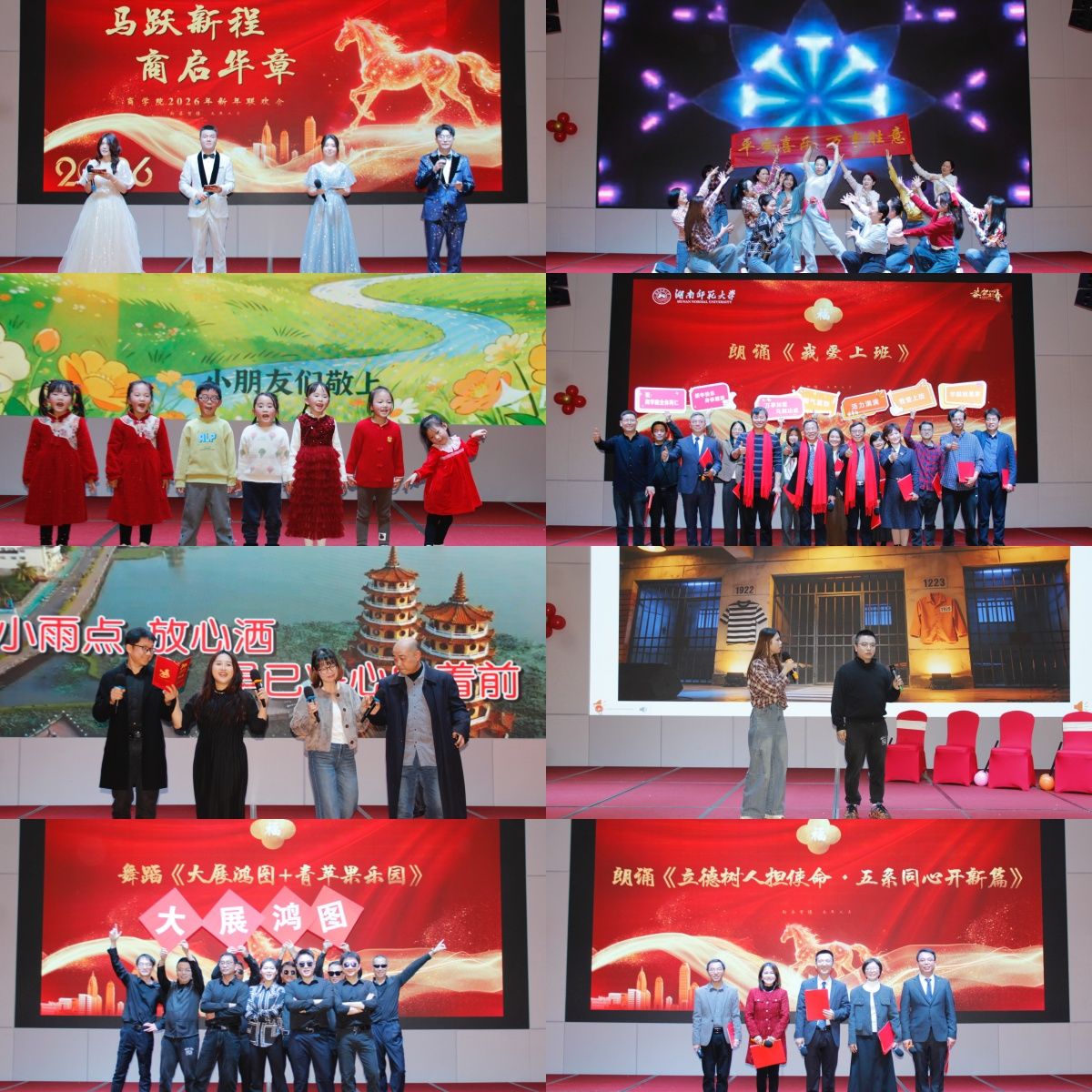 (通讯员:舒怡 周昕芮 吴幽)金樽共举辞旧岁,载歌载舞迎新春。1月15日下午,我院隆重举行“马跃新程・商启华章”2026年新年联欢会。湖南师范大学党委委员、副校长刘怀德教授,院党委书记龚舒,副院长曹虹剑、李红权、杜平,离退休老同志代表和全体教职工齐聚一堂,共庆新春,回顾过往,展望未来。商学院原党委书记何勇、原党委副书记刘杰受邀出席。