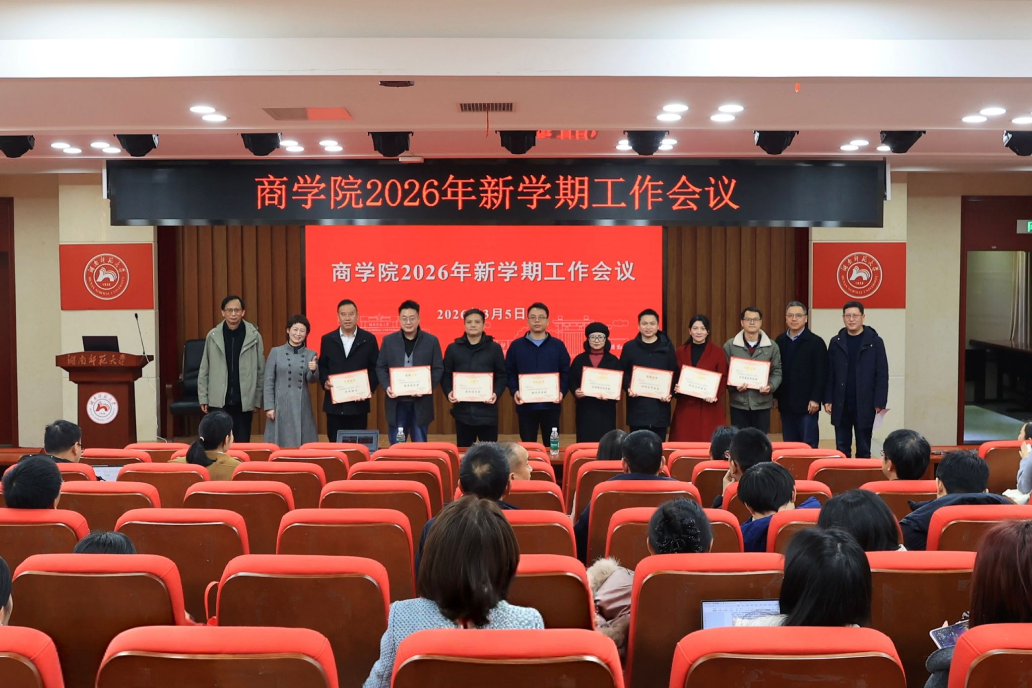 李红权宣读我院2024—2025学年教学、科研和管理优秀奖表彰名单,并围绕新学期的研究生和科研工作进行了部署和强调。全体院领导为获奖人员颁发荣誉证书。