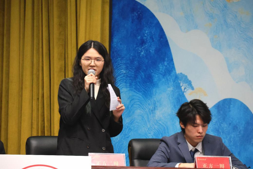 决赛辩题为:存续是/不是人类存续的最高价值。我院辩手持正方,先手发言。我方的论点为:人类文明面临生死存亡时,存续是价值冲突中不可让渡的优先项;人类文明演进史是以存续为核心筛选标准的“价值进化史”,与存续相悖的价值终将被淘汰。我方一辩开篇立论,阐述我方观点,在被质询的环节中冷静应对。二辩、三辩引经据典、旁征博引,从疫情期间我国保障民生的举措,到人类文明演进中因违背存续而消亡的案例,全方位论证存续的绝对优先性。自由辩论阶段,我方辩手紧密配合、相互呼应,不断强化己方观点。结辩环节,我方四辩以小见大、通过对自己“辩论生涯”的回望与告别。