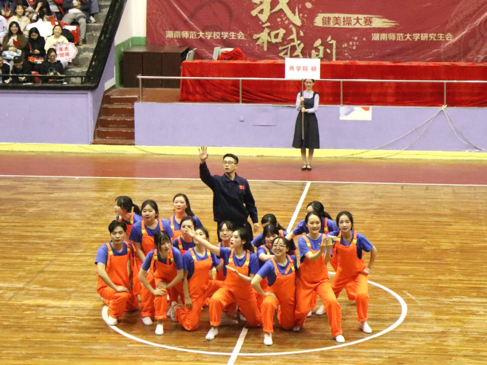(通讯员 王卓 廉雪洁 尚文琪)为庆祝中华人民共和国成立七十周年,4月21日晚,湖南师范大学第十六届女生节闭幕式暨“我和我的祖国”健美操大赛在北院体育馆举行。商学院本科生与研究生代表队经过近两个月紧锣密鼓的排练,为观众带来了精彩的视觉表演。商学院党委副书记陈君莅临观赛,学工办老师郭书畅亲自指导并参与此次学院健美操现场表演。