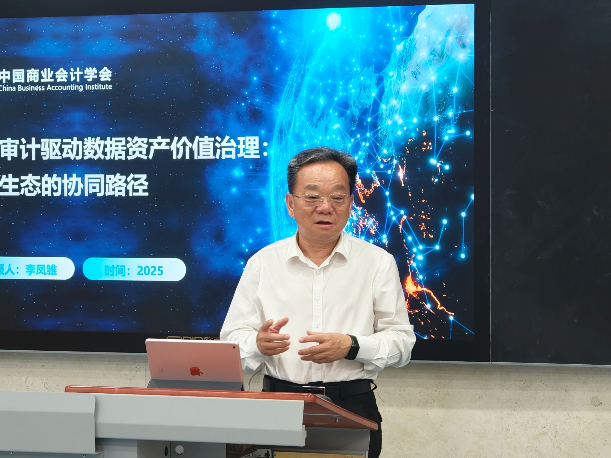 李凤雏以“会计审计驱动数据资产价值治理:数字生态的协同路径”为主题开展讲学。他围绕推进国家大数据战略、加快建设数字中国的重要战略部署,深入剖析会计变革、审计转型与生态协同三大核心展开,为数据资产价值释放与数字生态建设指明方向。他指出,数据已成为基础性战略资源,我国数据要素市场规模快速增长,但数据资源化利用率不足,大量数据仍处于“沉睡”状态;提出会计需突破传统假设,重构理论框架、进化计量准则、借力数字技术,搭建数据资产管理专业底座,推动数据资产入表落地。同时,数据资产审计需聚焦安全、合规与价值实现,构建技术、管理、价值三维框架,破解权属模糊、标准缺失等挑战,完善审计体系与人才认证机制。最后,他强调会计与审计具备天然职能互补性,通过制度、技术、流程三大协同,可实现价值发现与风险防控双重保障,未来应搭建“业—财—审”一体化平台,推动跨部门协同,探索数据资产市场化机制,形成数据资产价值治理的中国方案。