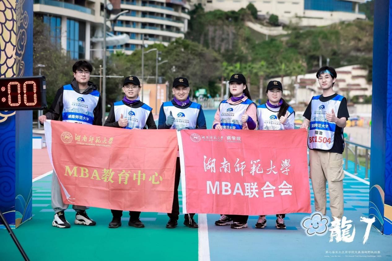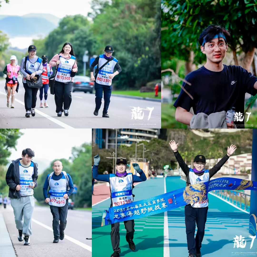 湖南师范大学商学院MBA教育中心主任蒋才芳教授带队参加了本届赛事,代表队由6名师生组成,全体队员秉持精诚团结的协作精神与坚毅不拔的意志品质,携手穿越30余公里赛道,历经沥青路、水泥路、机耕道、石阶、山路、石板路、石铺路、沙滩等多种地形,持续超越、勇毅前行。
