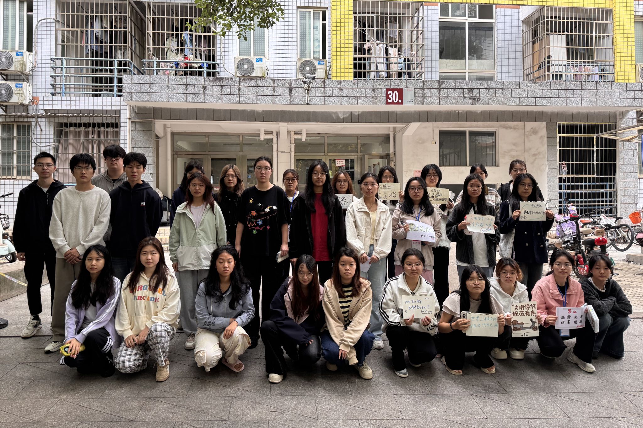 各小组携带标识分区域开展车辆整理工作。志愿者们相互配合,将停放在人行道、楼道口、绿化带旁的电动车逐一归位,统一规范至划定停车区停放。最后,志愿者们还在违规停放高发区域的墙面、柱子上张贴文明停车标识,提醒同学们自觉遵守停车规范。