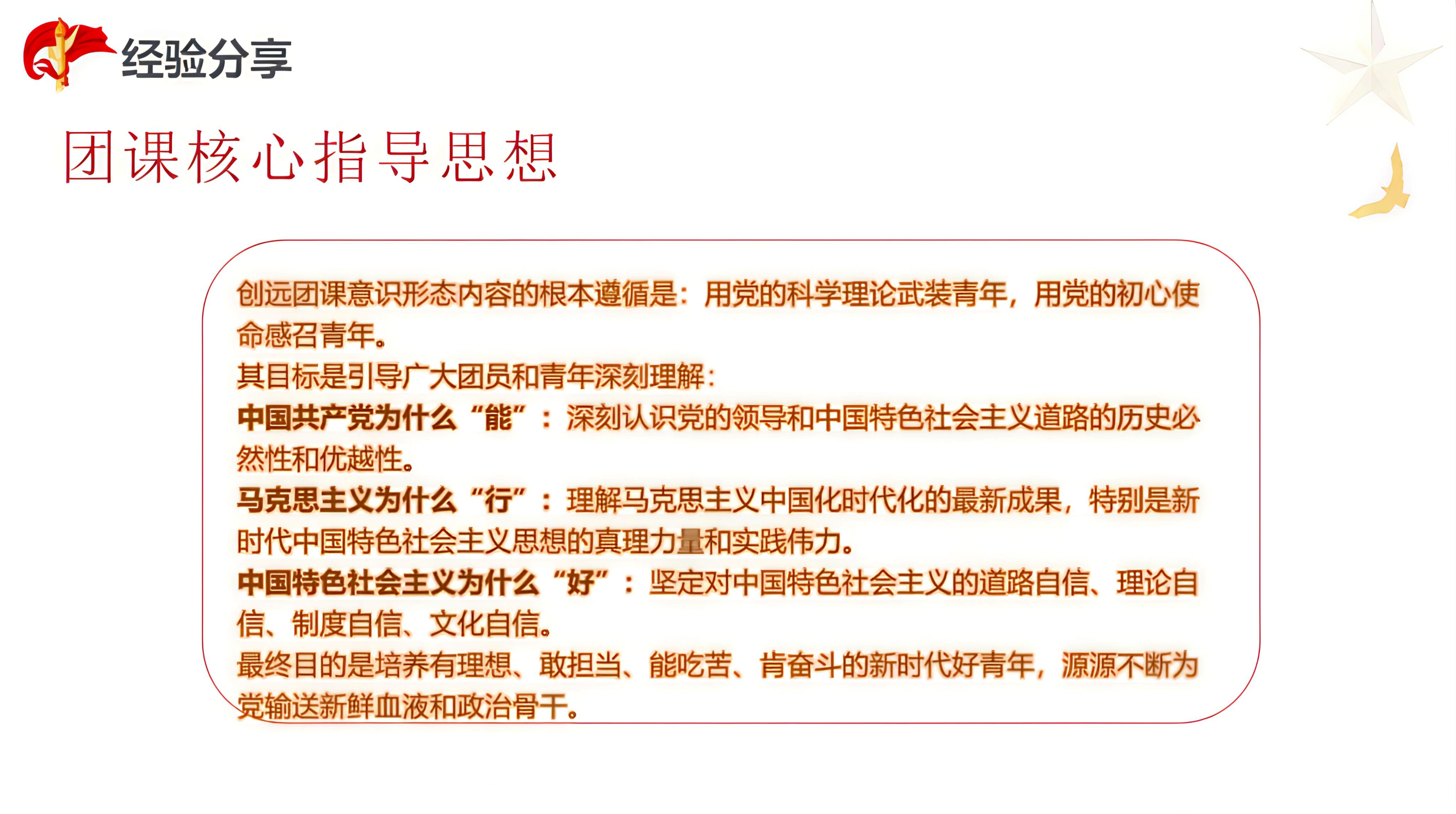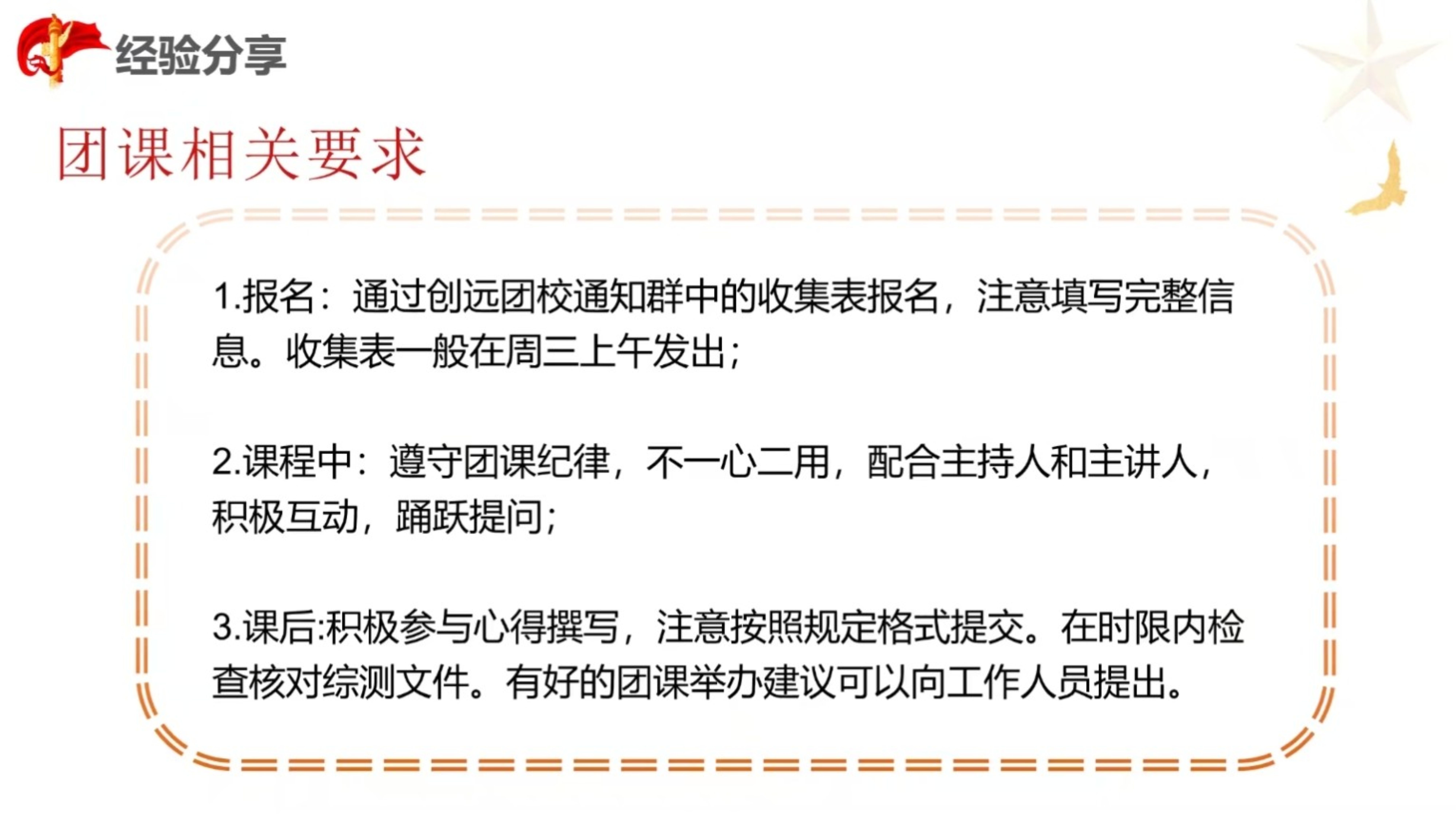 会议在激昂的团歌中拉开序幕。经验分享环节,杨鹿林结合青年成长需求与时代要求,分别从理论武装、理想信念、国情形势政策、团员意识与先进性、道德法治与奋斗精神等五个板块介绍了团课核心指导思想。林欣诺则聚焦团课落地执行,分别从讲授要点与原则、内容与形式创新、具体工作要求、纪律规范细则等方面展开培训说明,提醒同学们注意团课开展的规范性与实效性,为后续工作推进提供了清晰指引。答疑环节,同学们在会议聊天区积极聊天互动,杨鹿林、林欣诺两位主讲人结合团课设计初衷与工作实际,逐一进行回复。
