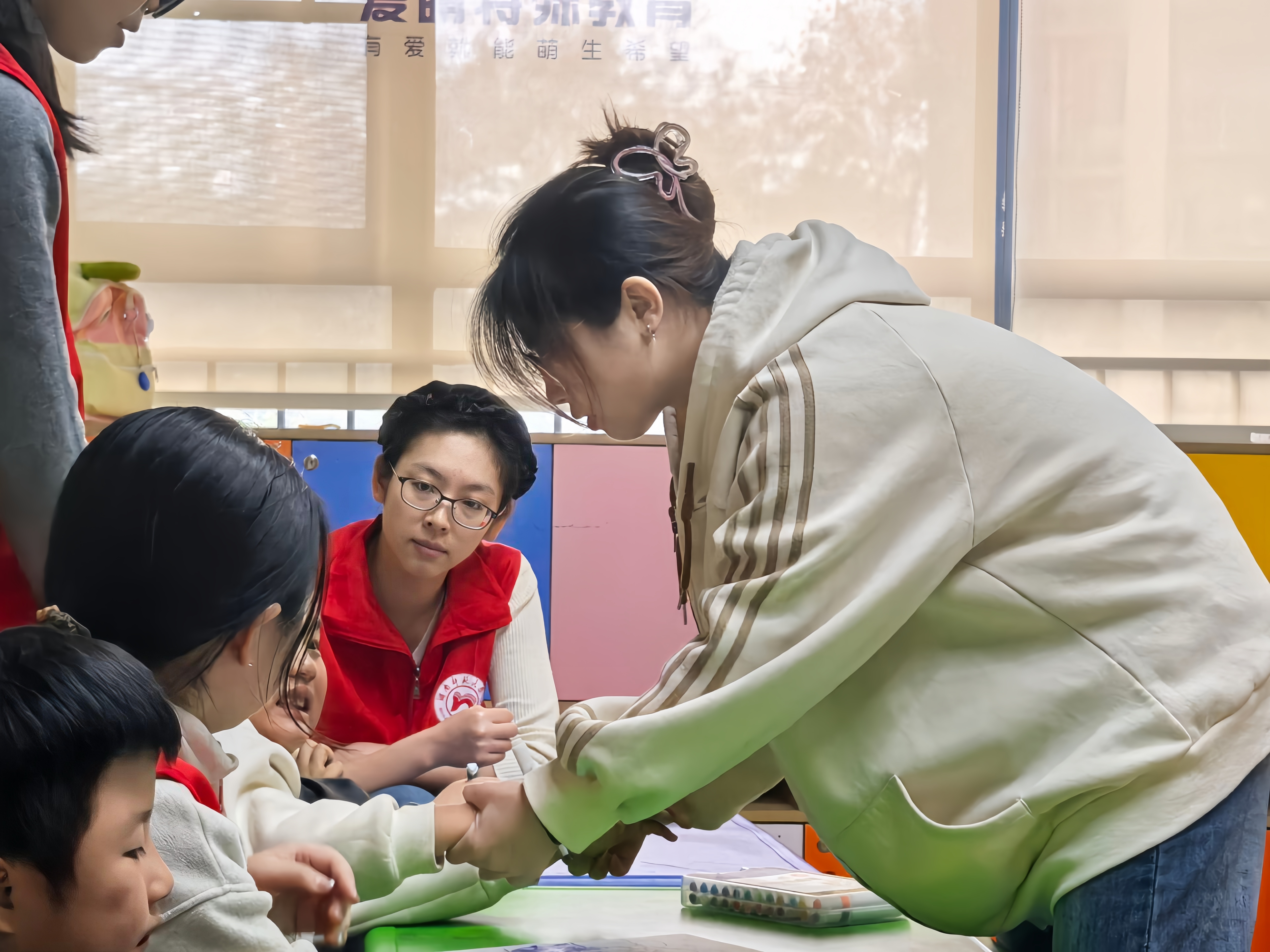活动伊始,志愿者们接受专项培训,学习如何与特殊儿童建立信任、进行有效沟通。随后,志愿者们与孩子们一一结对,共同开展彩纸贴画游戏。志愿者们还带领孩子们开展剪纸游戏,为孩子们准备了各色彩纸、胶水与剪刀等材料,他们不仅耐心示范撕纸、拼贴等步骤,还手把手地教孩子们如何将彩色纸片修剪成各式图案。通过示范引导与语言鼓励等方式,志愿者们引导孩子们积极投入到剪纸游戏中。