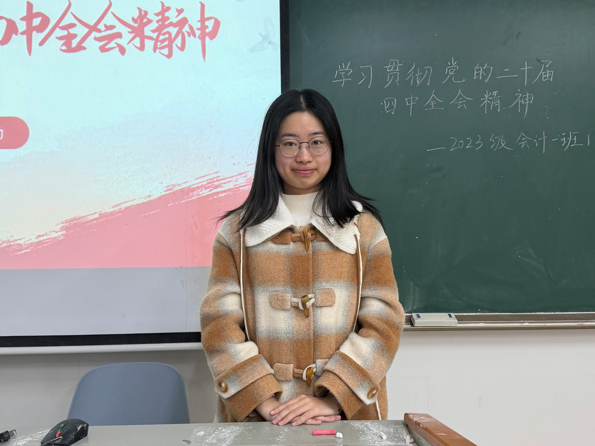 (通讯员 杨浩琳 刘瑛琪 程一诺)11月19日下午,2023级会计一班在中和楼113教室开展以“学习贯彻党的二十届四中全会精神”为主题的团日活动。团支书历彦孜担任此次活动主持人。