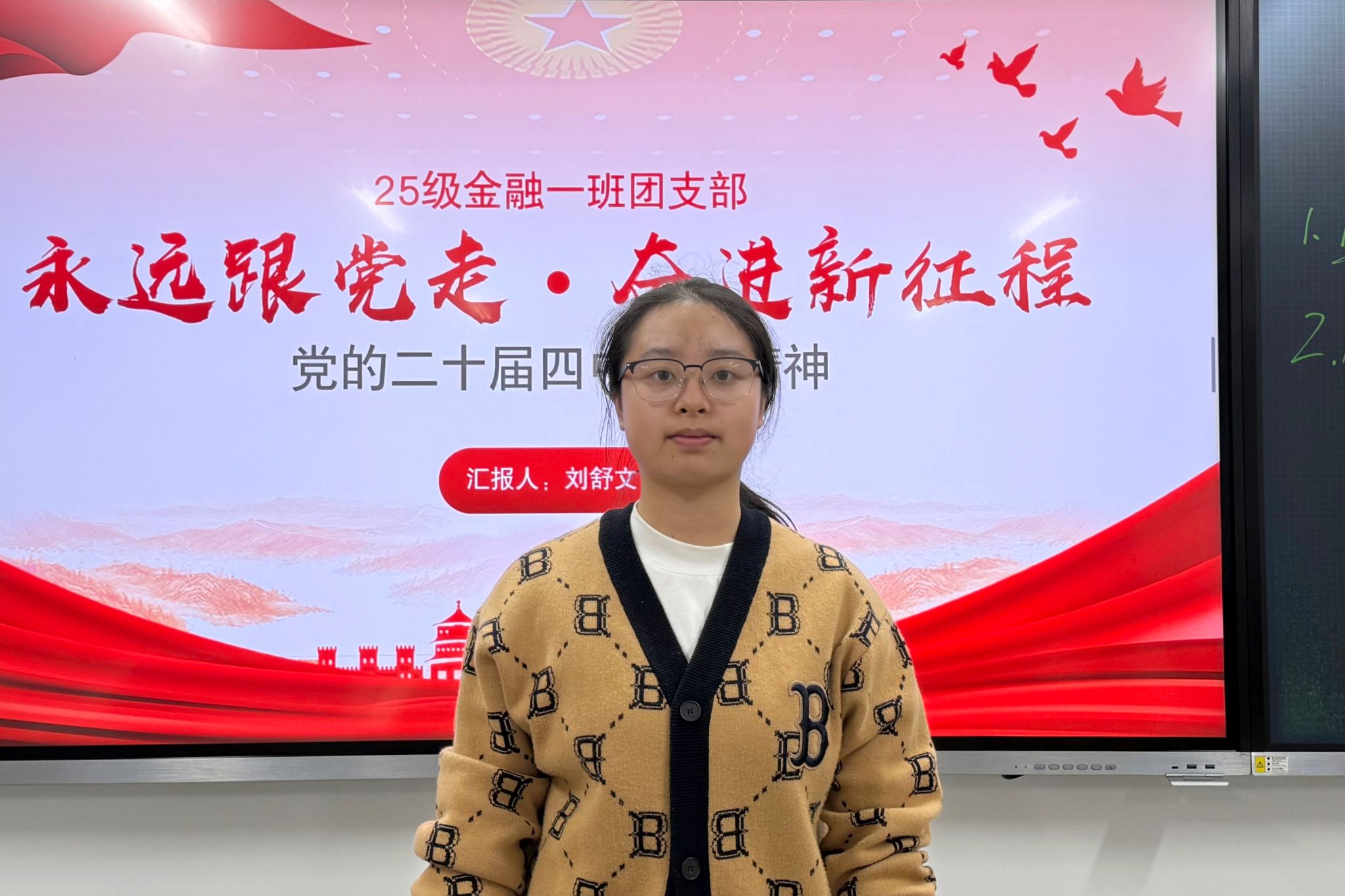 (通讯员 范子涵 杨依 马琳洨)11月20日晚,2025级金融一班于达善楼304教室开展了以“永远跟党走,奋进新征程”为主题的团日活动,团支书刘舒文担任此次活动主持人。