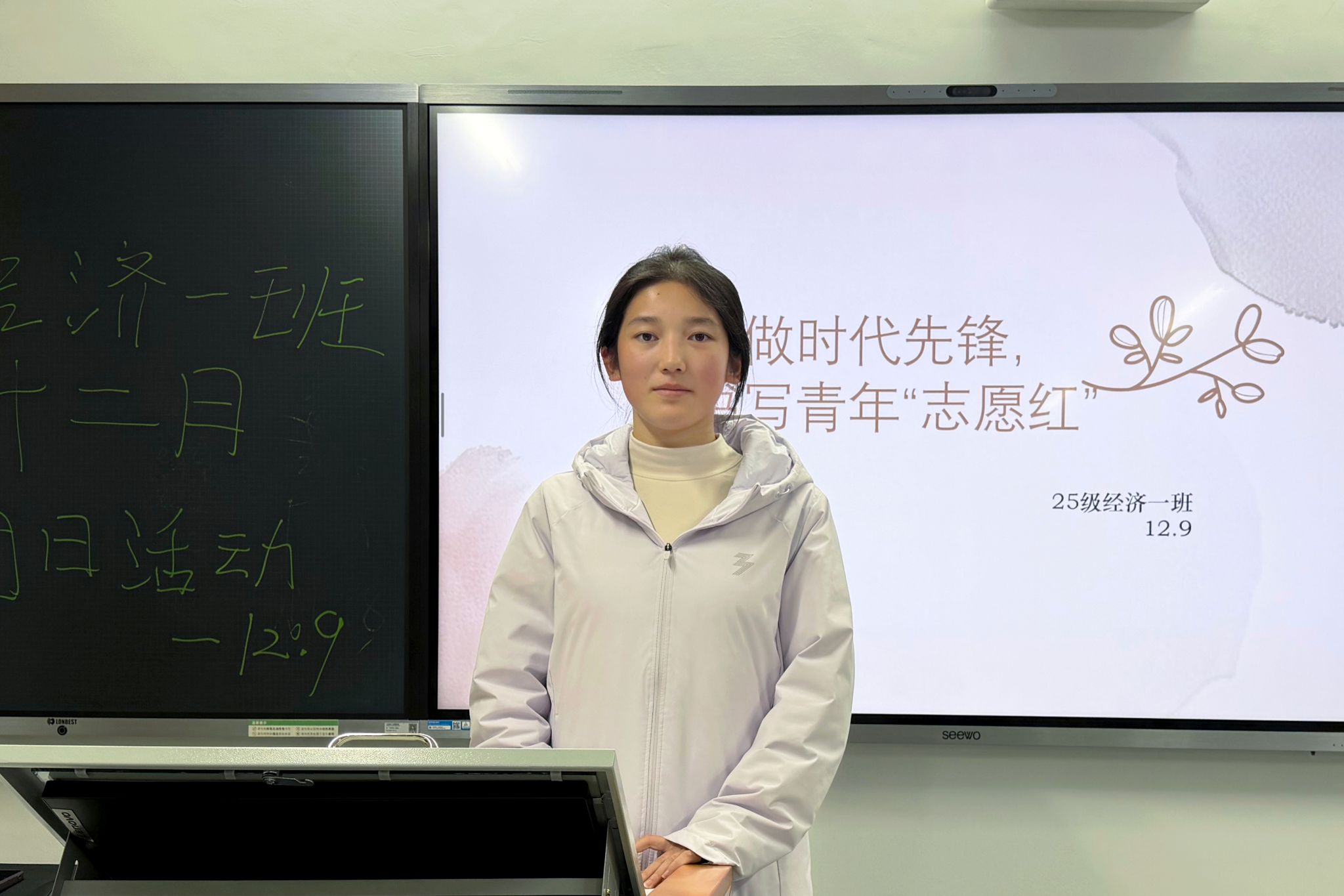 (通讯员 马琳洨 庞若含 祝郑果尔)12月9日晚,2025级经济一班在桃花坪校区达美楼307教室开展“争做时代先锋,书写青年‘志愿红’”主题团日活动。团支书肖语瞳担任此次活动主持人。