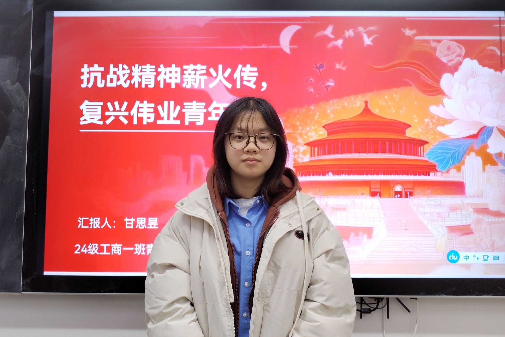(通讯员 陈栩 程一诺 韩至远)12月12日下午,2024级工商一班青马小组在中和楼210教室开展“抗战精神薪火传,复兴伟业青年担”主题学习活动。小组成员甘思昱担任此次活动主持人。