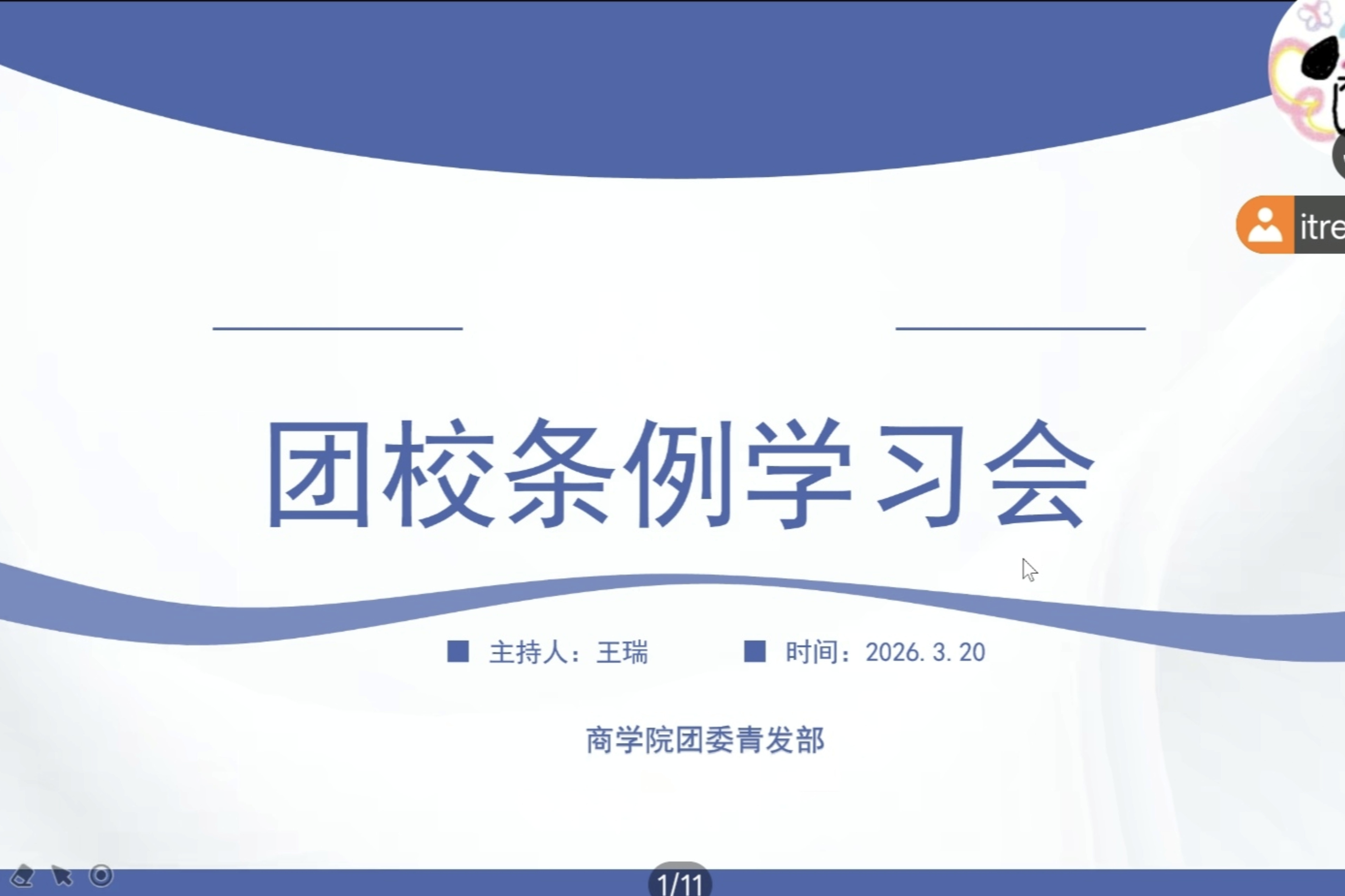 (通讯员 程一诺 祝郑果尔 曹佳伟)3月20日中午,我院团委在线上开展团校条例学习会。此次会议由2025级本科生王瑞担任主持人,2024级本科生杨鹿林、罗雅雯担任主讲人。