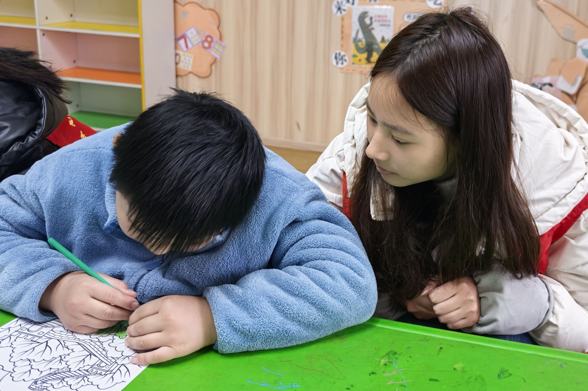 志愿者们首先学习放慢语速、肢体安抚等沟通技巧,与孩子们进行有效沟通。随后,志愿者们围绕“春日风物绘”主题,带领孩子们用铅笔勾勒花草、树木等春日景致,引导孩子们在细致描摹中感受自然之美。“我的春日小世界”创作环节中,志愿者们俯身,耐心引导孩子们大胆落笔,陪伴孩子完成每一笔创作。最后,志愿者携手孩子们将完成的画作整理成“春日纪念册”,记录下温暖的陪伴时光。