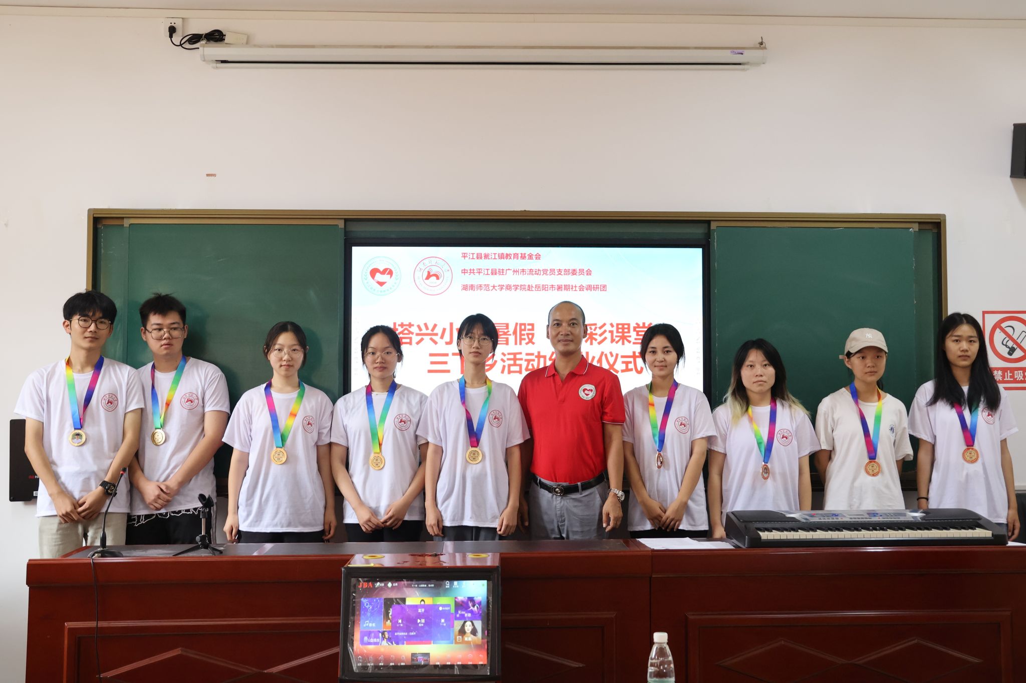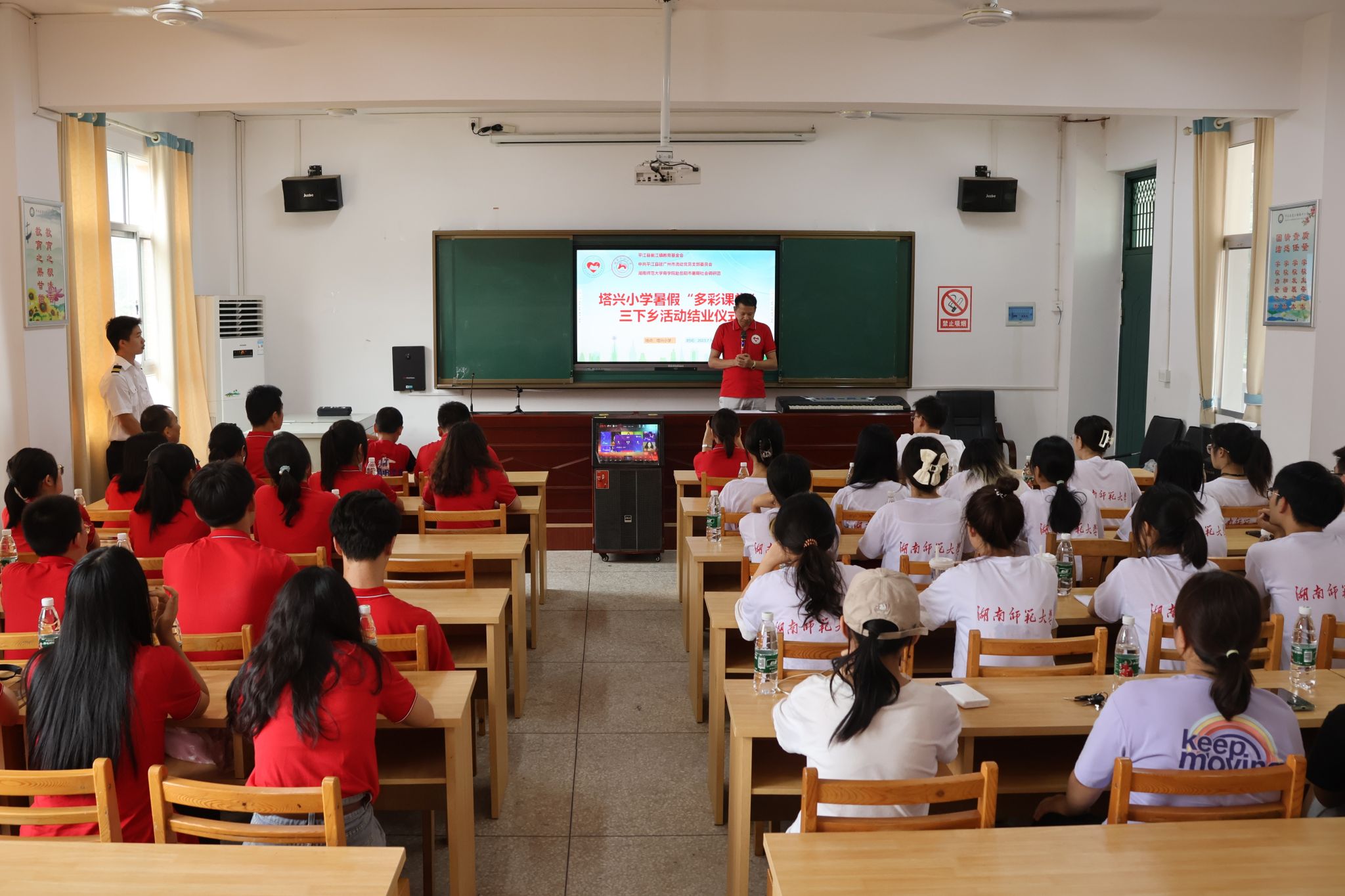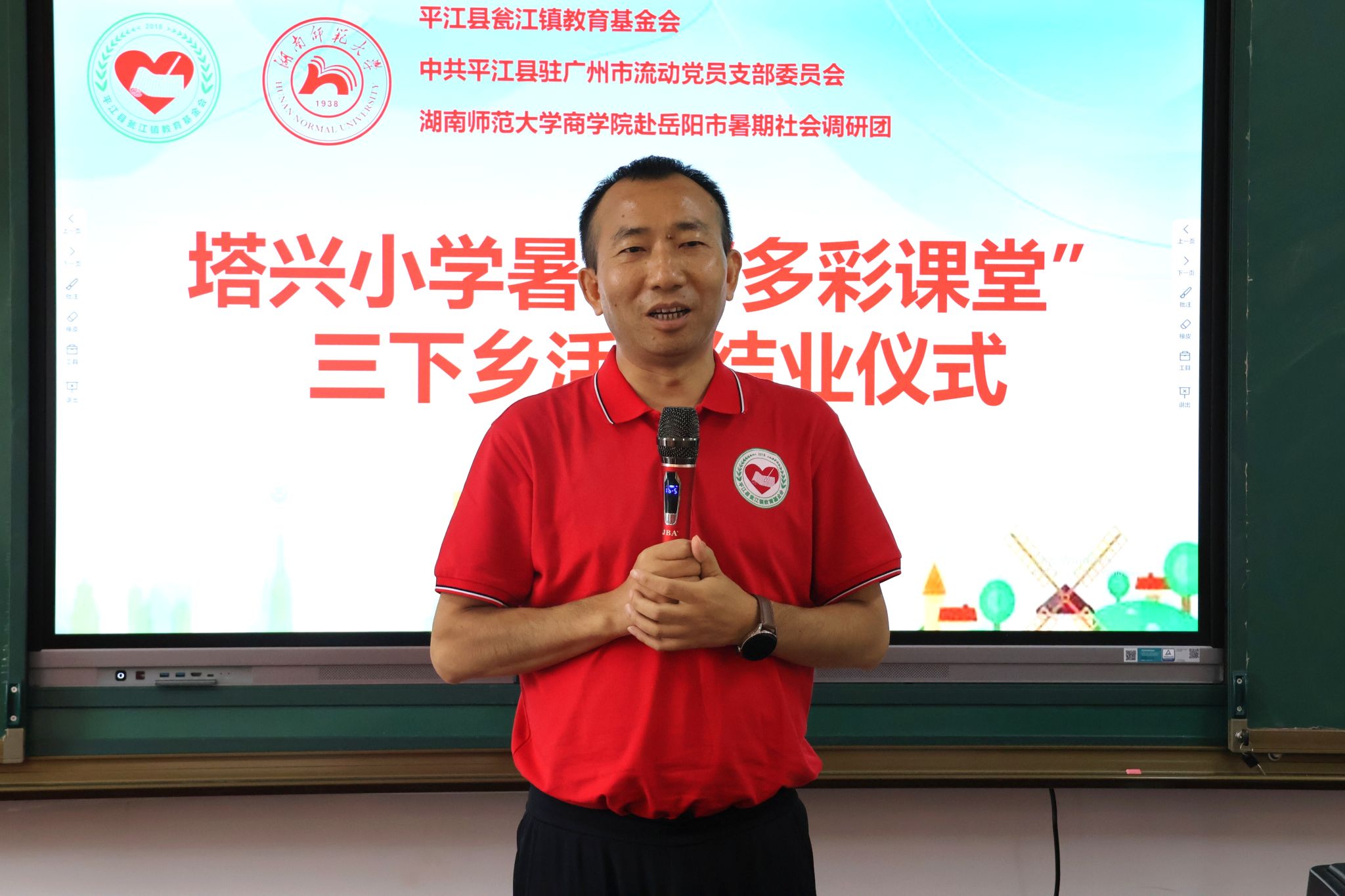 (通讯员 黎锦 杨凤鸣 邹子怡)7月15日下午,商学院赴岳阳市暑期社会调研团联合平江县瓮江镇教育基金会志愿者队伍,于塔兴小学多功能会议室举行暑期“多彩课堂”三下乡活动结业仪式暨总结表彰大会。志愿者队伍队长李奕洋担任主持人,瓮江教育基金会理事长凌琳、副秘书长朱满跃、塔兴小学教导主任凌立文出席会议。