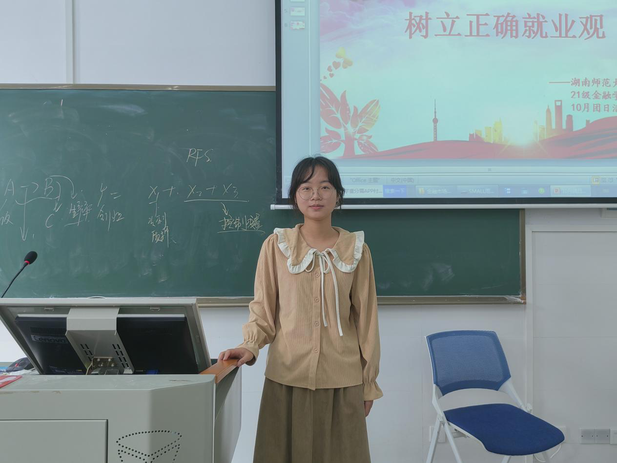 (通讯员 崔怡凡 陈乐 唐思佳)为帮助同学们树立正确的择业观、就业观,10月12日下午,2021级金融班于中和楼114教室开展“树立正确就业观”主题团日活动。此次活动由团支书唐雨乐主持。