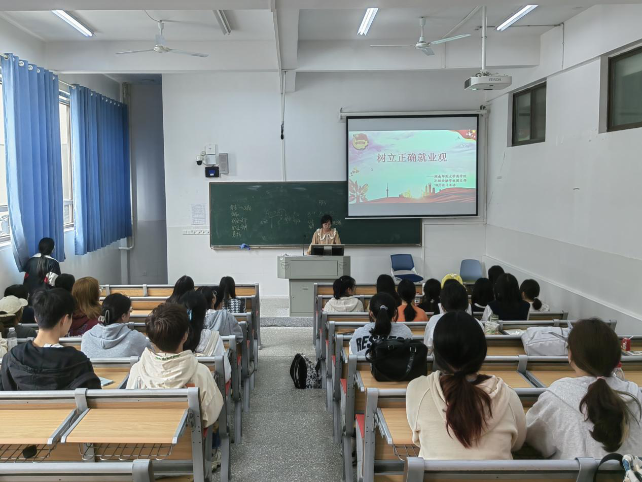 唐雨乐引导同学们从专业知识、实操能力、身体素质、心理心态等多个方面了解自身综合素质,从而帮助大家树立正确的择业目标,明确奋斗方向。随后,她对我国普通高校毕业生人数日益增长,劳动力供大于求的现状进行简单介绍,并表示此问题在短期内还不能完全得到解决,作为未来的求职者,同学们应当不断锤炼本领,主动把握就业机会。活动尾声,唐雨乐简单介绍了自主择业观、平等就业观、竞争就业观等多种就业价值观念,并号召同学们结合自身情况,树立正确的择业观。