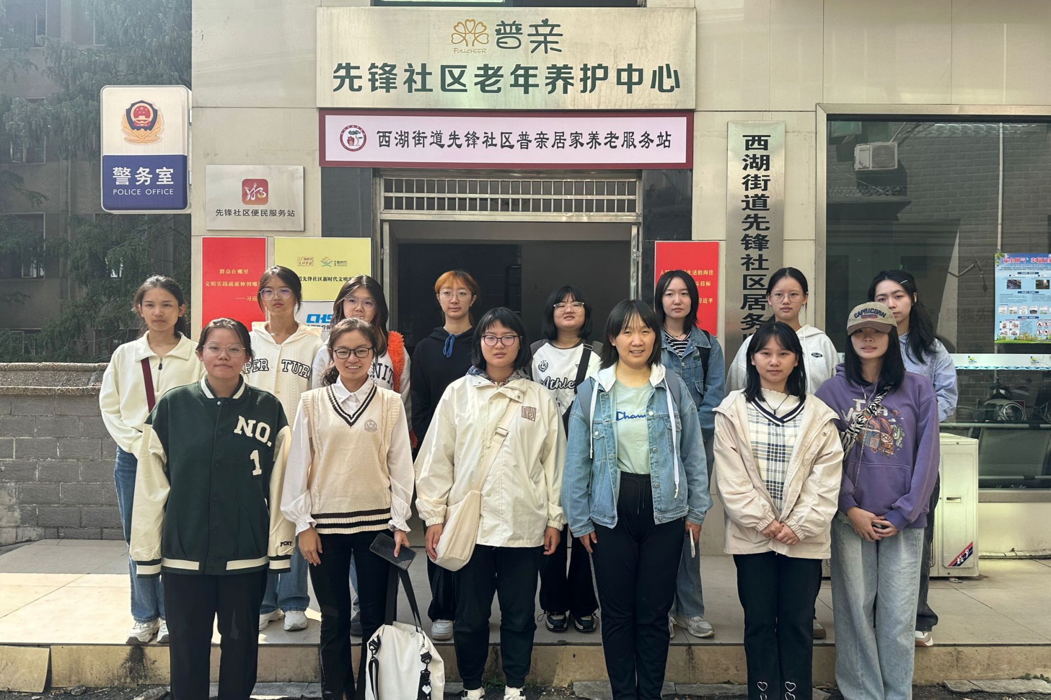 普亲春雷老年养护院相关工作人员为志愿者们详细介绍各位老人的性格特点、生活习惯和健康状况,并安排志愿者与老人们互动。活动进行中,志愿者根据班级分组,与老人们聊天、下棋,倾听老人们的故事,部分志愿者与工作人员进行歌舞表演。休闲活动之余,志愿者将老人们送回房间用餐,并帮助工作人员打扫房间卫生。活动结束后,全体志愿者在普亲春雷老年养护院门口合影留念。