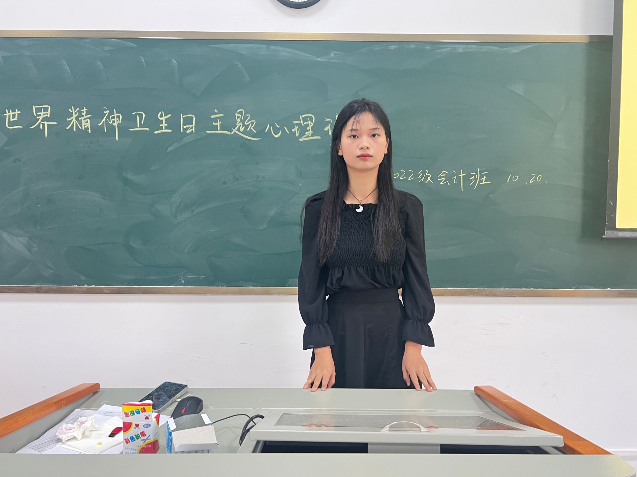 (通讯员 万正强 钱嘉富 李雯)10月20日下午,2022级会计班在咸嘉湖校区老图书馆502教室开展以“世界精神卫生日”为主题的心理班会。心理委员谭洁担任此次活动的主持人。