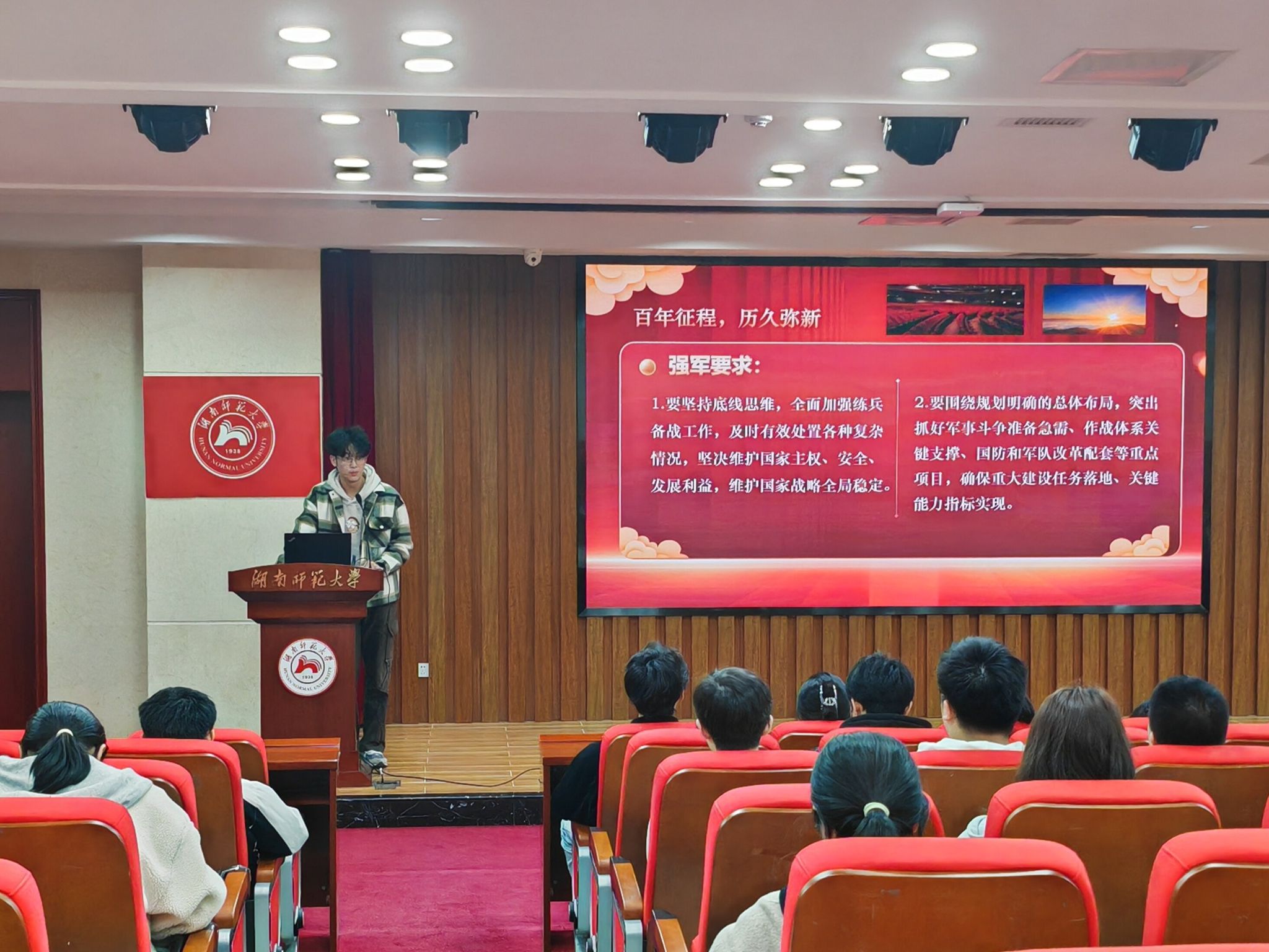 会议伊始,学生会成员通过一则短片学习了解祖国的伟大历程和伟大成就。欧阳宇翔就新时代强军思想、经济思想、法治思想进行讲解。他结合两会报告进一步阐释习近平经济思想的内涵和推进全面依法治国的重要性意义。谭进杰讲述了如何贯彻学习习近平生态文明思想、如何全面认识习近平外交思想以及如何深入理解习近平文化思想。他结合国家发展历程,点明这些思想中所蕴含的“和平发展,合作共赢”的精神内核,并对学生会成员提出了要求与期待。