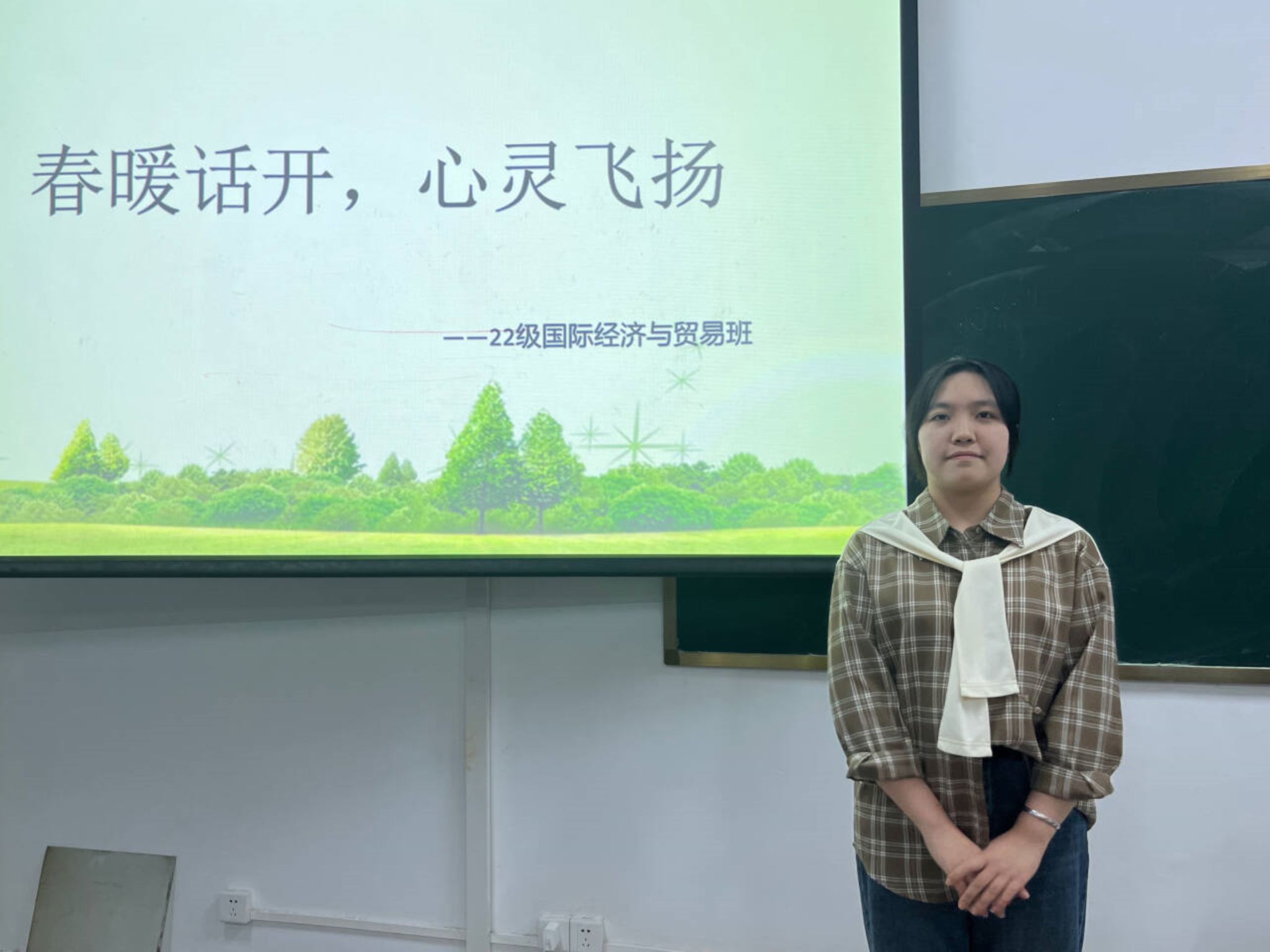 (通讯员 彭心怡 朴思颖 周昕芮)4月18日,2022级国际经济与贸易班于咸嘉湖老图书馆301教室开展以“春暖话开,心灵飞扬”为主题的心理班会,心理委员朴思颖主持此次班会。