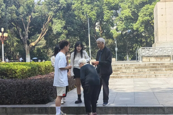志愿者抵达东方红广场,李欣姿组织志愿者撰写赠给老人的祝福纸条,并向志愿者介绍重阳节的相关传统。志愿者向广场内的老人送上祝福纸条并与老人进行亲切交谈。在志愿者的合作下,此次活动共送出30余张祝福纸条,老人们表示感受到了年轻一辈的温暖善意,并对此次活动给予了充分肯定。陈雯娟为参与此次活动的全体志愿者合影留念。
