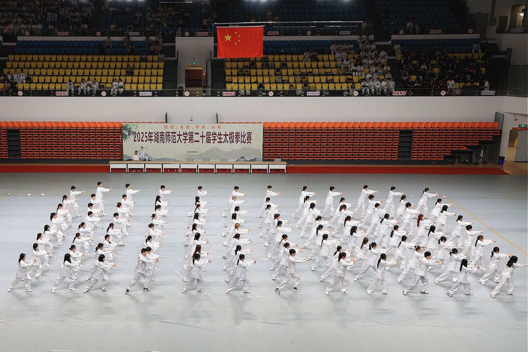 此次比赛分为团体赛和个人赛,其中个人赛分为男生组和女生组,每组三人。为保证比赛顺利进行,赛前队员们提早开始热身活动,在中和楼前集合排练。比赛开始,队伍迈着整齐的步伐跑上比赛场地,在评委席前列阵,同时喊出“千锤百炼,王者商院”的口号,展现出商学院学子饱满昂扬的精神状态。队员们快速变换队形,分为四个小方阵和一个簇拥着正中央舞者李美玉的大方阵,她身姿轻盈,为大家展示了一段柔美的古典舞。随着音乐的节奏,四个小方阵用手翻花摆出“HNNU”的造型。在队伍迅速恢复成大方阵后,全体成员在音乐中缓缓起势,举手投足间,虚实相生、开合有致。